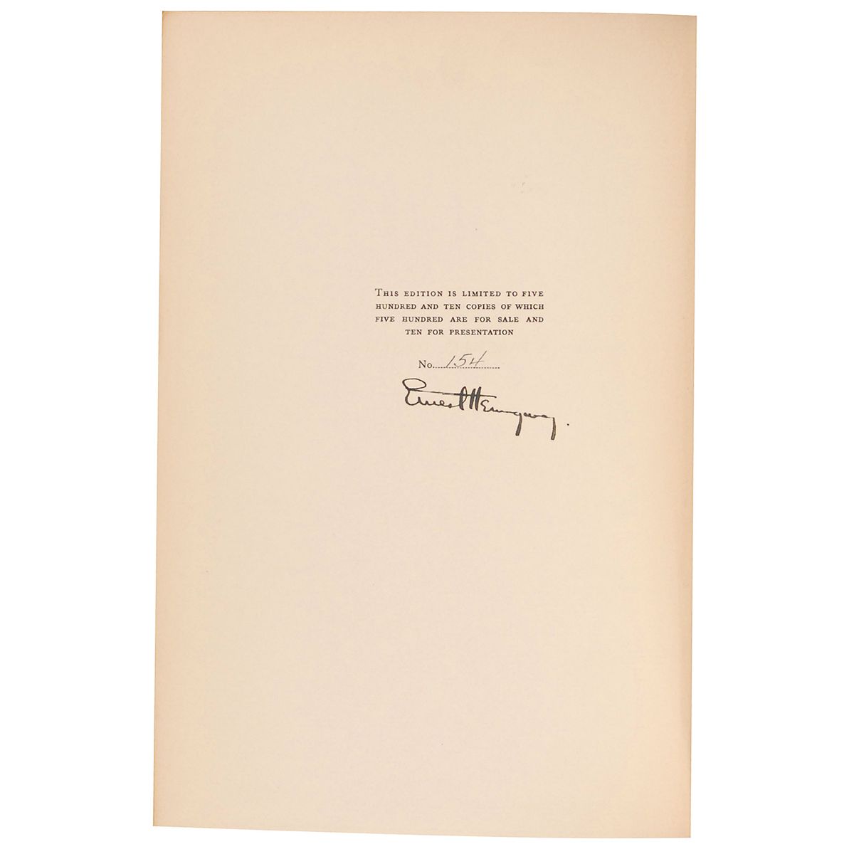 Signed book: A Farewell to Arms. Limited first edition of 510 copies (this being No. 154). NY: Charles Scribner's Sons, 1929. Hardcover, 6.25 x 9.25, 355 pages. Boldly signed on the colophon in black ink. Autographic condition: fine, with a bit of mild edge toning. Book condition: VG/None. An excellent example of Hemingway’s first best-selling novel which helped established him as one of the premier writers of the time.