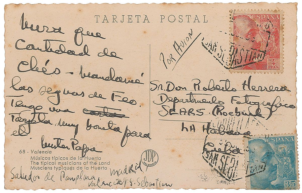 Scarce postcard signed “Papa,” 5.25 x 3.25, featuring an image of musicians in Valencia, no date. Hemingway pens a brief note in Spanish to Roberto Herrera, a close friend, part-time secretary, and brother of his Cuban doctor. Also addressed in Hemingway’s hand. Scattered foxing and a crease to one corner tip, otherwise fine condition.