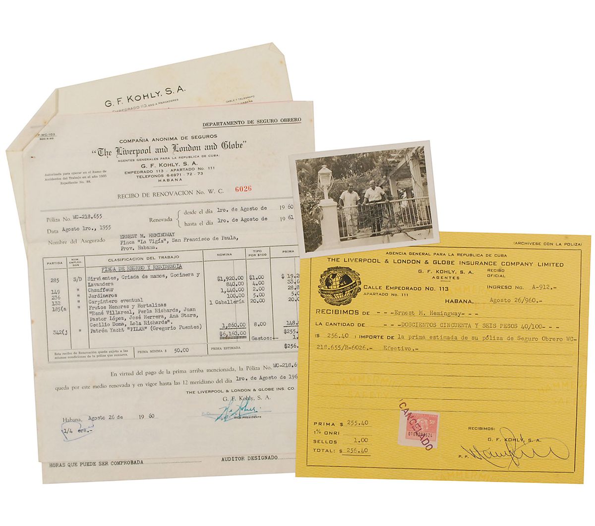Small archive of Hemingway-related documents in Spanish, totaling 7 pages, 8.5 x 11, August 26, 1960, providing proof of workers’ compensation insurance for his ‘Finca La Vigia’ home in Cuba. Includes a cover letter from G. F. Kohly, his insurance agent in Havana, noting his policy number as “WC-218.655”; an insurance certificate filled out in type listing his employees, including a chauffeur, gardeners, carpenter, and “Patron Yacht ‘Pilar’ (Gregorio Fuentes),” with carbon copy; two carbon copies of a payroll report; and a receipt for the payment of that year’s premium, bearing a “Cancelado” stamp. The policy would run for one year, from August 1, 1960, to August 1, 1961—by which time Hemingway would be dead. Also includes a candid glossy 4 x 3 snapshot of two men on the veranda of Hemingway’s home, showing Rene Villarreal on the left and another, possibly Jose Luis Herrera Sotolongo, on the right. Villarreal wrote the 2009 book entitled Hemingway’s Cuban Son—Reflections on the Writer by his Longtime Majordomo. In overall fine condition. Archive originates from the personal property of Roberto Herrera Sotolongo, who was Hemingway’s close friend, part-time secretary, and brother of his Cuban doctor. A one-of-a-kind archive of materials related to Hemingway’s beloved home, a revered Cuban landmark that tourists flock to even today.