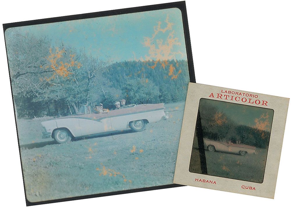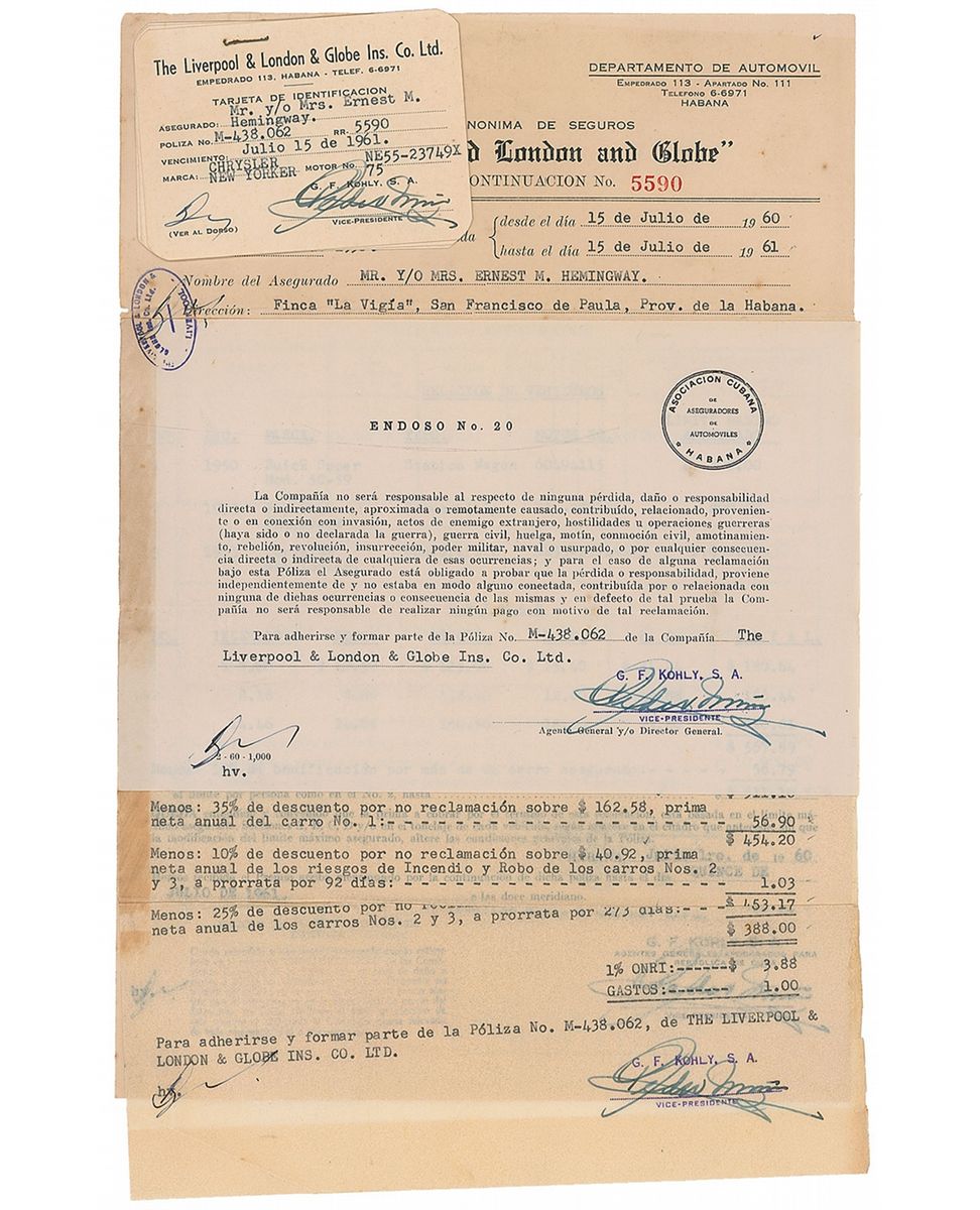 Document in Spanish, two pages, 8.5 x 13.5, July 15, 1960. Hemingway’s last automobile insurance policy for the three cars at his Finca Vigia home in Cuba, a “1950 Buick Super Mod. 50-59 Station Wagon,” “1953 Plymouth Cranbrook Convertible,” and a “1955 Chrysler New Yorker Convertible.” A rider is also affixed to the left side, and three insurance cards (one for each car) are stapled to the upper left. The policy would run for one year, from July 15, 1960, to July 15, 1961—by which time Hemingway would be dead. Also includes an original color slide and modern reprint of four people in the Chrysler convertible. In overall fine condition, with expected document wear, and scattered spotting to slide. Items originate from the personal property of Roberto Herrera Sotolongo who was Hemingway’s close friend, part-time secretary, and brother of his Cuban doctor. Hemingway was involved in many car accidents during his life—though most long before this document—and many speculate that injuries sustained contributed to the chronic pain that factored into his decision to end his life.