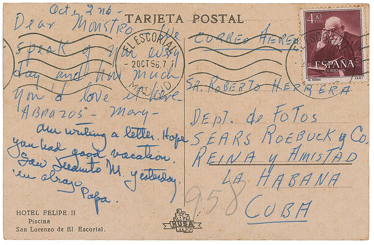 ALS signed “Un abrazo, Papa,” one page on a 5.5 x 3.5 postcard showing a swimming pool at Hotel Felipe II, postmarked Madrid, October 2, 1956. Brief note sent to Roberto Herrera in Havana. In full: “Am writing a letter. Hope you had a good vacation. Saw Juanito M. yesterday.” Above, his wife wrote: “We speak of you every day and how much you’d love it here. Abrazos, Mary.” Postcard is also addressed in Mary’s hand. In fine condition. Originates from the personal property of Roberto Herrera Sotolongo who was Hemingway’s close friend, part-time secretary, and brother of his Cuban doctor. In October 1956, Hemingway traveled to Europe and met Basque writer Pio Baroja, who was seriously ill and passed away shortly thereafter.