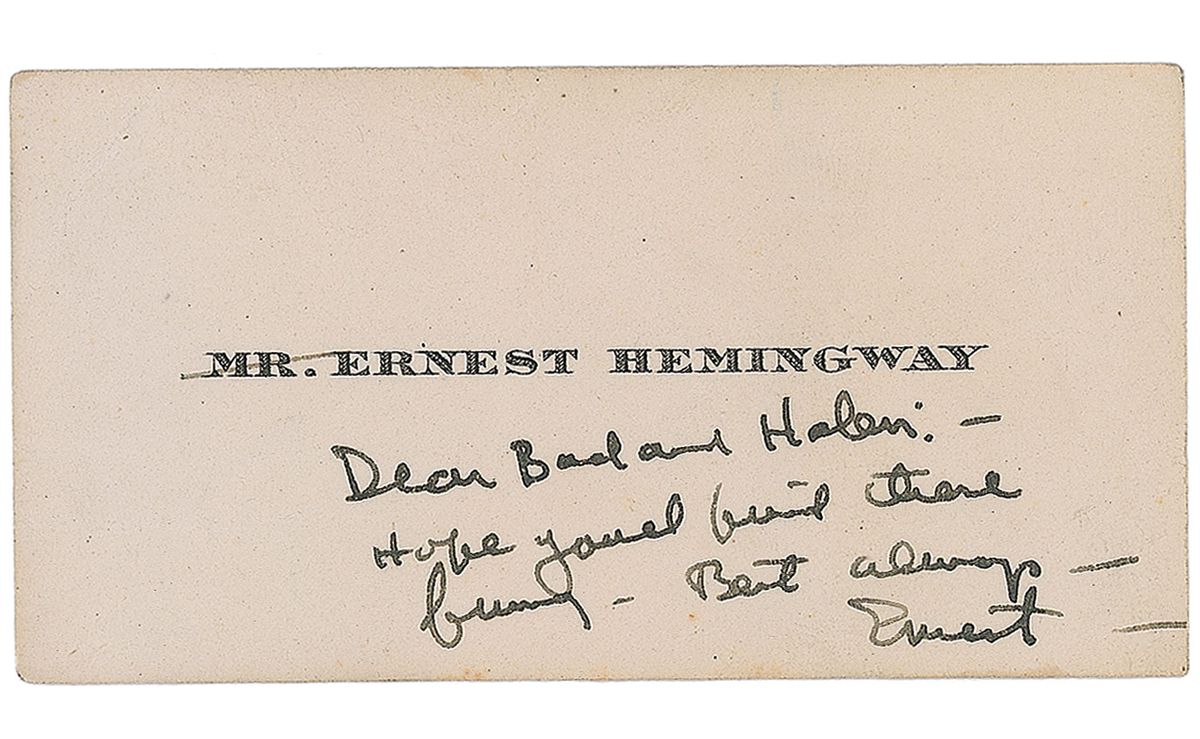 Hemingway’s personal calling card bearing his name printed in the center, 3 x 1.5, with a bold ANS penned at the bottom, in full: “Dear Bud and Helen:—Hope you’ll find these funny—Best wishes—Ernest.” In fine condition, with mounting remnants to reverse. An unusual and rarely seen format.