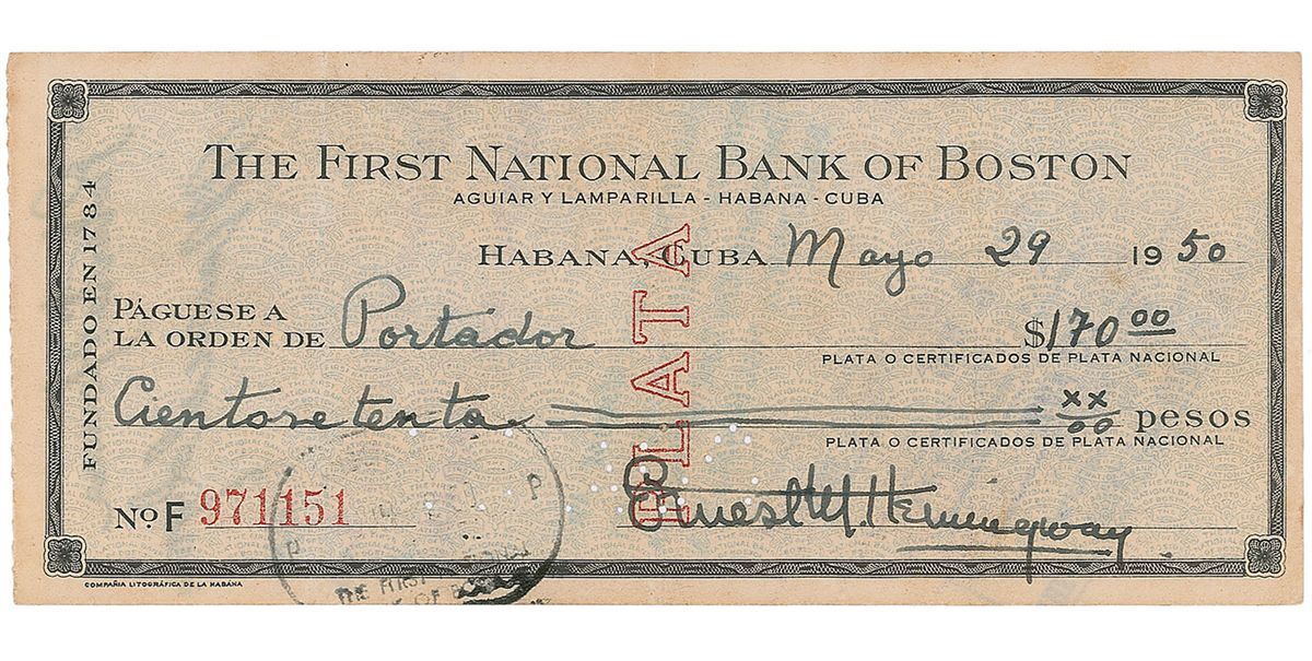 Bank check, 6.25 x 2.75, filled out in another hand and signed by Hemingway, payable to Portador for $170.00, May 29, 1950. Reverse is endorsed by Hemingway’s friend and fishing companion Roberto Herrera. In fine condition, with two light vertical folds, one through a single letter of signature, stamp to lower left, and cancellation holes lightly affecting first name of signature.