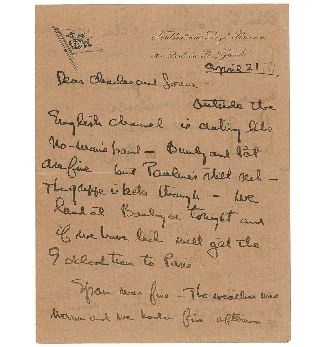 ALS signed “Ernest,” four pages on two adjoining sheets, 5.5 x 7.5, Norddeutscher Lloyd letterhead, April 21, no year but circa late 1920s. Letter to Charles and Lorine Thompson in Key West. In part: “Outside the English Channel is acting like no-man’s land—Bumby and Pat are fine but Pauline’s still sick—The grippe is better though—We land at Boulogne tonight and if we have luck will get the 9 o’clock train to Paris—Spain was fine—The weather was warm and we had a fine afternoon in Vigo. The next morning we were at Coruna and then all the next day along the coast of Spain—Snow still on the tops of the mountains—went ashore at Gijon at night and wandered around the town—then pulled out across the Bay of Biscay and this morning in the English Channel with a northern blowing and a gray mist…Someone has written in pencil on the inside of our wardrobe—The Germans is a wonderful people but this boat is terrible!…Thanks so much for sending the guns—the Tuna have left Vigo they pulled out in January and won’t be back until August—They migrate like Kingfish—How big are your Tarpan now?—Does Waldo still hold the record? You’d need all your thin blood for how cold it is outside now. They took the temperature of the water just now—it was 7.5—in the gulf it was 20 centigrade—It takes a better man than Pappa to figure those into Fahrenheit—but 20 is HOT and 7.5 is DAMN COLD.” Uniform toning and light show-through from writing to opposing sides, otherwise fine condition. Accompanied by the original mailing envelope, addressed in his own hand and incorporating his full signature, “Ernest Hemingway” into the return address on the flap.