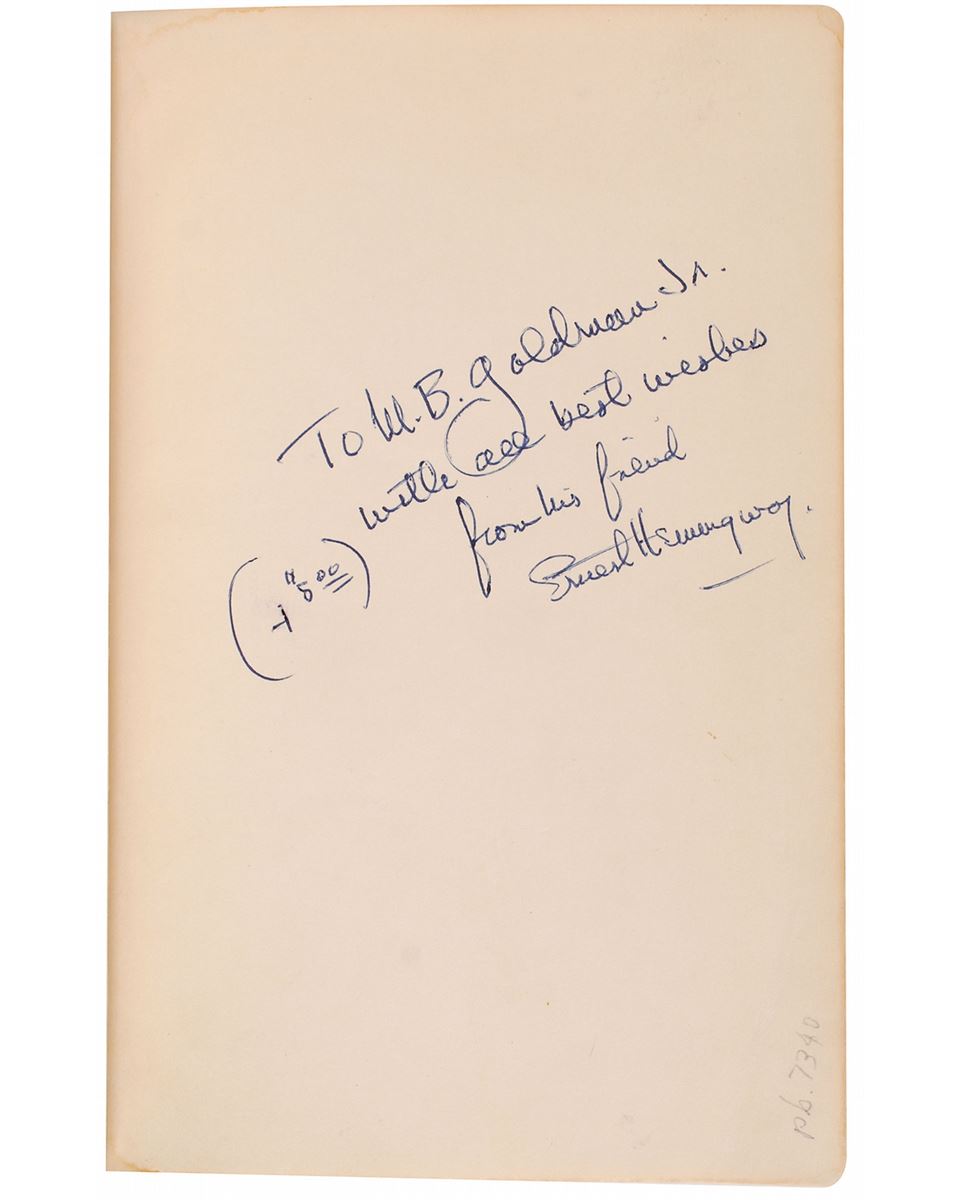 Signed book: The Short Stories of Ernest Hemingway. Later printing. NY: Charles Scribner's Sons, 1955. Hardcover, 6 x 8.5, 499 pages. Signed and inscribed on the first free end page in blue ballpoint, “To M. B. Goldman Jr., with all best wishes (+$5.00) from his friend Ernest Hemingway.” Autographic condition: fine, with mild toning and soiling to first free end page and Goldman’s ownership inscription to front pastedown. Book condition: VG+/None. Goldman was a founder and the first chairman of The Phoenix Jewish News. He was on a cruise with his wife in the 1950s when she bet him five dollars that a fellow passenger was Ernest Hemingway—Mrs. Goldman won the bet.