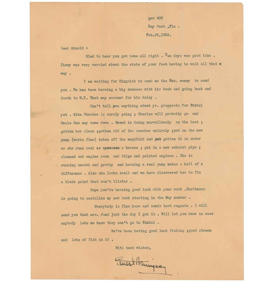 TLS, one page, 8.5 x 11, February 26, 1935. Letter to Arnold Samuelson. In part: “I am waiting for Gingrich to send me the Mss. money to send you. He has been haveing [sic] a big success with his book and going back and forth to N.Y. That may account for his delay. Can’t tell you anything about yr. prospects for Bimini yet. Mike Strater is surely going; Charles will probably go and Uncle Gus may come down. Bread is doing marvellously on the boat; gotten her clean; gotten rid of the roaches entirely; put on the new pump (works fine) taken off the manifold and gotten it in order so she runs cool as a breeze; put in a new exhaust pipe; cleaned out engine room and bilge and painted engines. She is running smooth and pretty and haveing [sic] a real pump makes a hell of a difference. Also she looks swell and we have discovered how to fix a black paint that won’t blister. Hope you’re haveing [sic] luck with your work. Scribners is going to serialize my new book starting in the May number. Everybody is fine here and sends best regards. I will send you that mss. fund jack the day I get it. Will let you know in case anybody lets me know they can’t go to Bimini. We’ve been having good luck fishing; good stream and lots of fish in it.” In fine condition, with intersecting folds and light soiling. Accompanied by the original mailing envelope.