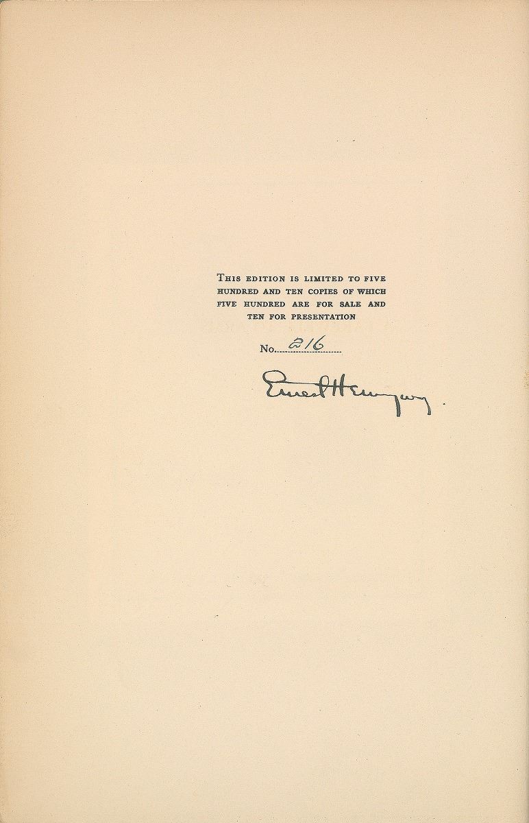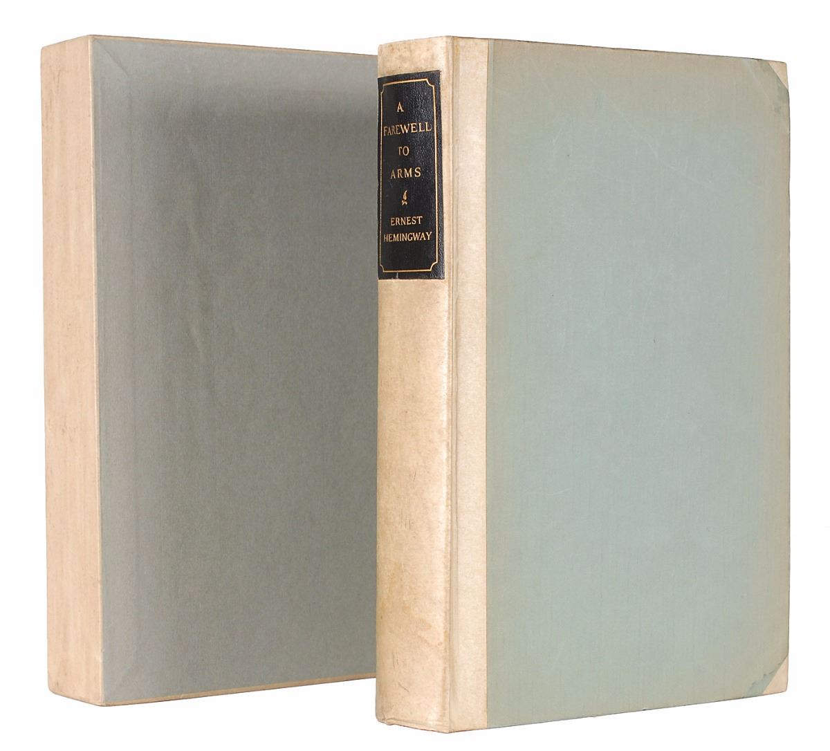 Signed book: A Farewell to Arms. First edition, limited issue, numbered 216/510. NY: Charles Scribner's Sons, 1929. Hardcover bound in paper and vellum, with slipcase, 6.25 x 9.25, 355 pages. Beautifully signed on the colophon in fountain pen. Autographic condition: fine. Book condition: VG+/None, in a VG+ slipcase; bookplates affixed to front pastedown and free end page, and first free end page bears an ownership inscription.
