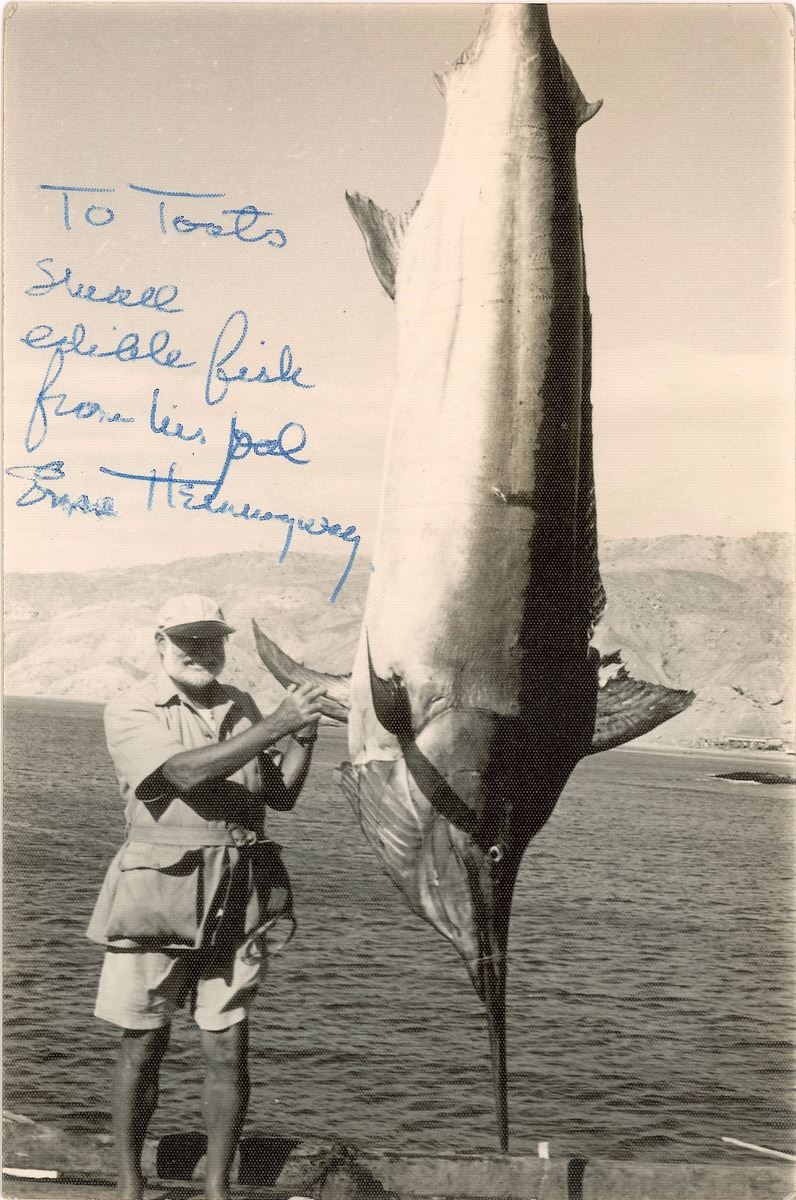 Exceptional vintage matte-finish 4 x 6 photo of the author posing next to a huge marlin, signed and inscribed in blue ballpoint to famed restaurateur Toots Shor, “To Toots, small edible fish from his pal Ernie Hemingway.” In fine condition, with initial irregular ink adhesion to first name.