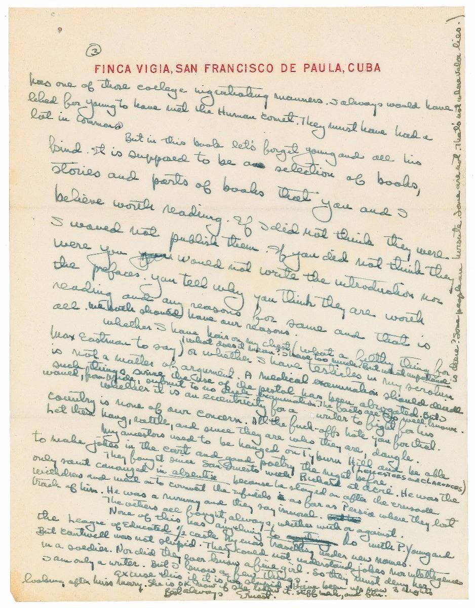 ALS signed “Ernest,” three pages, 8.5 x 11, Finca Vigia letterhead, February 7, 1953. Letter to Charles Poore, a New York Times literary critic who wrote extensively on Hemingway and his work. In full: “Thanks very much for the two letters. I’m sorry I took up your time bitching about P[hilip] Young. It will be a long time before he puts me out of business, although I think he had high hopes when he sat down to the typewriter for the first time. It’s always funny when they write about something that you really know about.