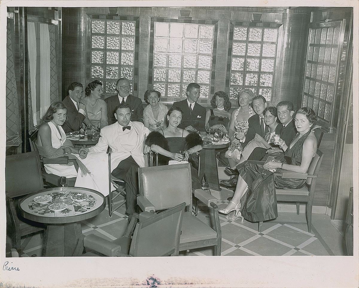 Extremely scarce vintage glossy 10 x 8 group photo of Hemingway, his wife Mary, and others seated at a dinner party, signed and inscribed on the reverse in fountain pen (translated), “For Pierre, respectful homage, your boyfriend, Ernest Hemingway.” Ink notation in lower left border in another hand. Reverse bears several inscriptions to “Pierre” from other dinner guests, as well as a photo stamp, “S/S Flandre, Cie Gie Transatlantique, Photos Jacques Lucas, French Line.” In fine condition, with some light discoloration along the lower edge of the photo’s border. A stark departure from the more typically seen images of Hemingway on safari or vessel, this wonderful, one-of-a-kind photo shows the scribe immersed in a formal social setting.