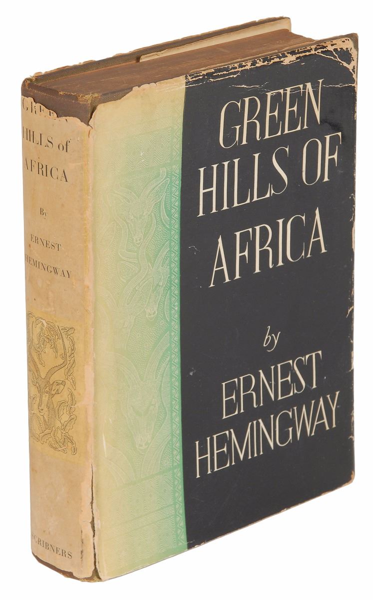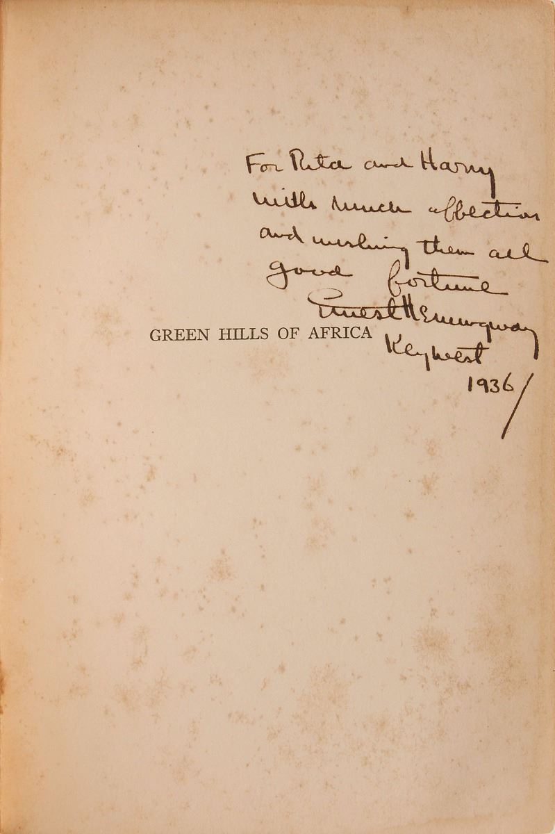 Signed book: Green Hills of Africa. Later printing. NY: Charles Scribner's Sons, 1935. Hardcover with dust jacket ($2.75 price), 6 x 8.5, 295 pages. Signed and inscribed on the half-title page in fountain pen, “For Rita and Harry, with much affection and wishing them all good fortune, Ernest Hemingway, Key West, 1936.” Autographic condition: very good, with scattered moderate foxing. Book condition: VG-/VG-, with boards and spine toned at edges, cracked front hinge, some scattered foxing, pages slightly browned, and wear and chipping to dust jacket with some losses at top and spine.