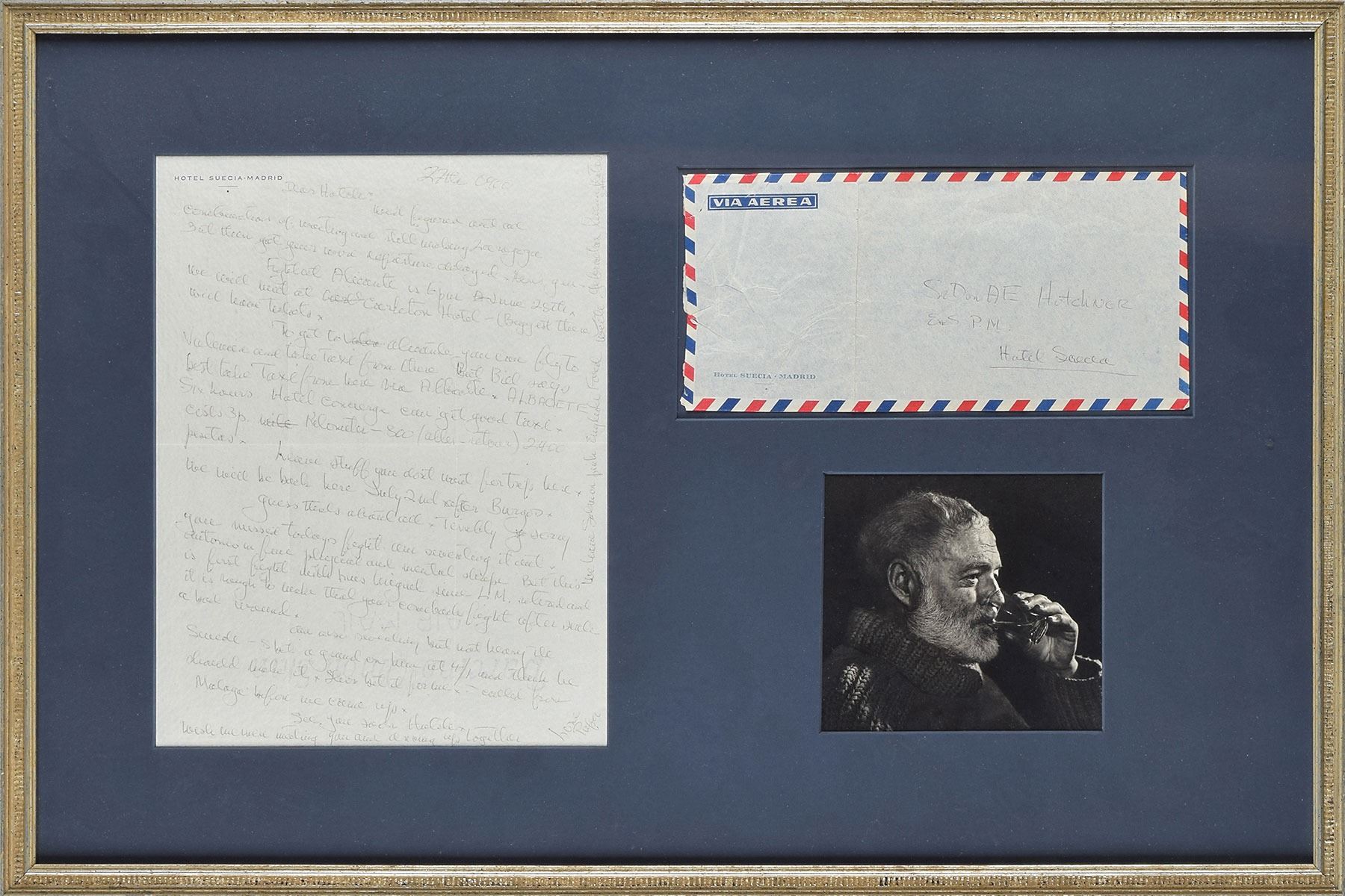 Leave stuff you don’t want for trip here. We will be back here July 2nd after Burgos. Guess that’s about all. Terribly sorry you missed todays fight. Am sweating it out. Antonio in fine physical and mental shape. But this is first fight with Luis Miguel since L.M. retired and it is rough to make that your comeback fight after such a bad wound. Am also sweating but not heavy the Swede…bet a grand on him at 4/1 and think he should make it…See you soon Hotch. Wish we were meeting you and driving up together." He adds a postscript in the right margin: "We have Salmon pink English Ford with Gibralter license plates, E. H." Matted and framed with the original envelope (addressed in Hemingway's hand) and a portrait to an overall size of 24 x 16. In fine condition, with light overall fading.