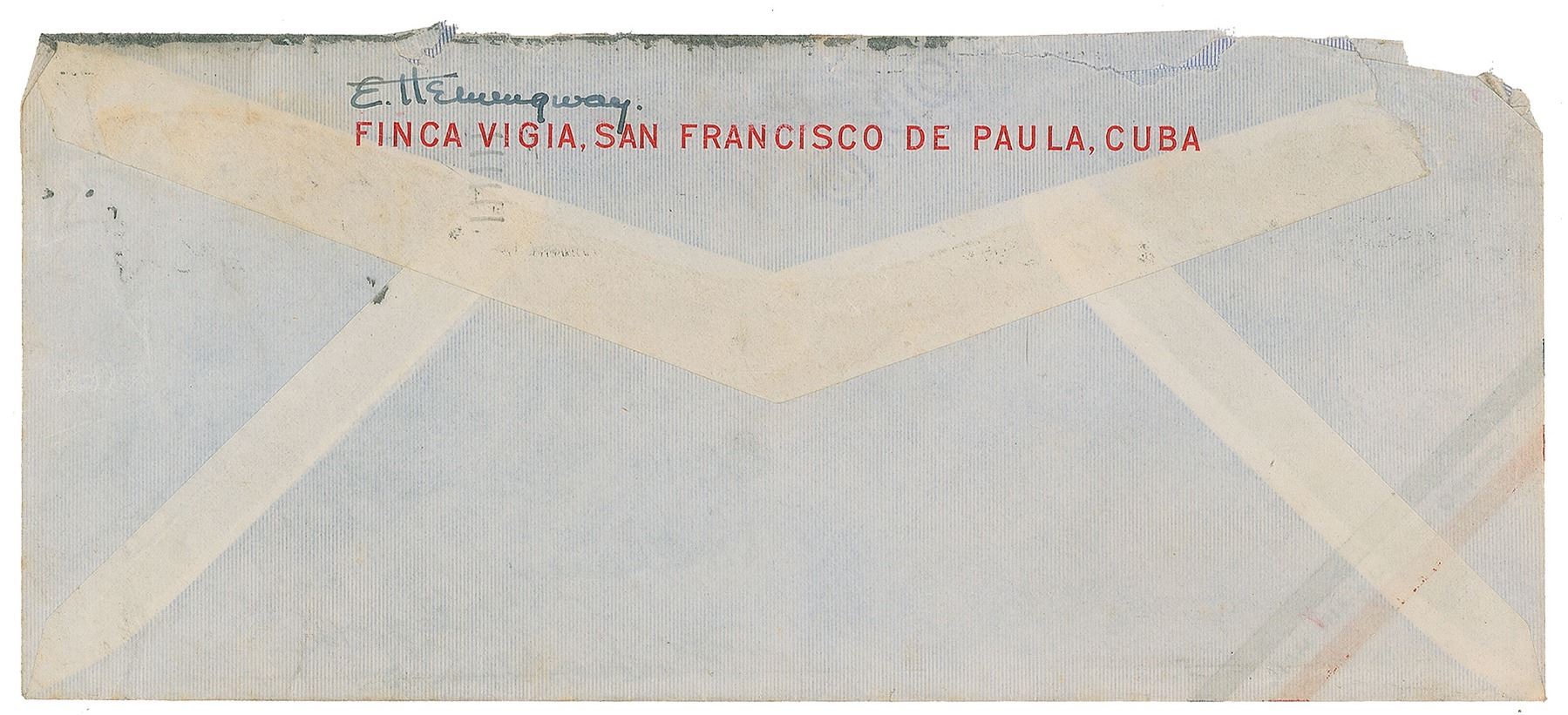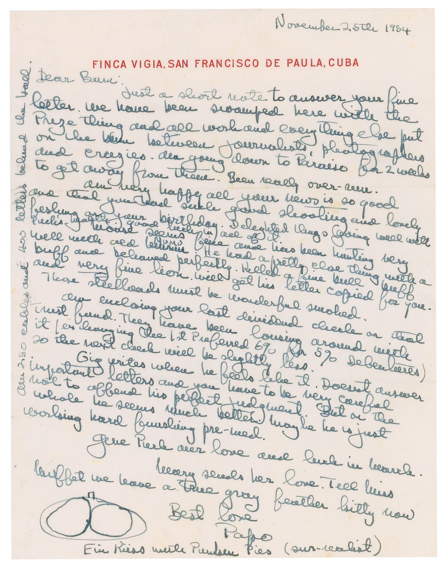 ALS signed “Papa,” one page, 8.5 x 11, Finca Vigia letterhead, November 25, 1954. Letter to "Bum," his son John (nicknamed 'Bumby'), commenting on his recent receipt of the Nobel Prize for Literature and offering other family news. In part: "We have been swamped here with the Prize thing and all work and everything else…between journalists, photographers and crazies. Am going down to Paraiso for 2 weeks to get away from them. Been really over-run. Am very happy all your news is so good and that you had such good shooting and lovely fishing on your birthday. Delighted things going well with Puck's health…Mouse [Hemingway's son Patrick] seems fine and has been hunting very well with old Mumu. He had a pretty close thing with a buff and behaved perfectly. Killed a fine bull buff and very fine lion. Will get his letter copied for you. Those steelheads must be wonderful smoked. Am enclosing your last dividend check on that trust fund…Gig [Hemingway's son Gregory] writes when he feels like it. Doesn't answer important letters and you have to be very careful not to offend his perfect judgment. But on the whole he seems much better. Maybe he is just working hard pursuing pre-med." At the conclusion, Hemingway outlines an ovoidal sketch with the subtitle “Ein Reiss with Preußen Pies (sur-realist).” Includes the original mailing envelope, addressed in Hemingway's hand to "John H. N. Hemingway Esq.," and signed above the return address on the flap, "E Hemingway." In fine condition.