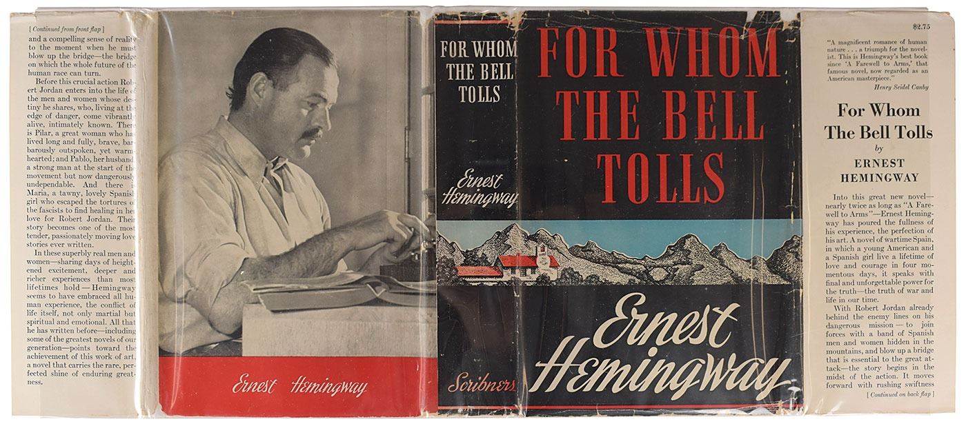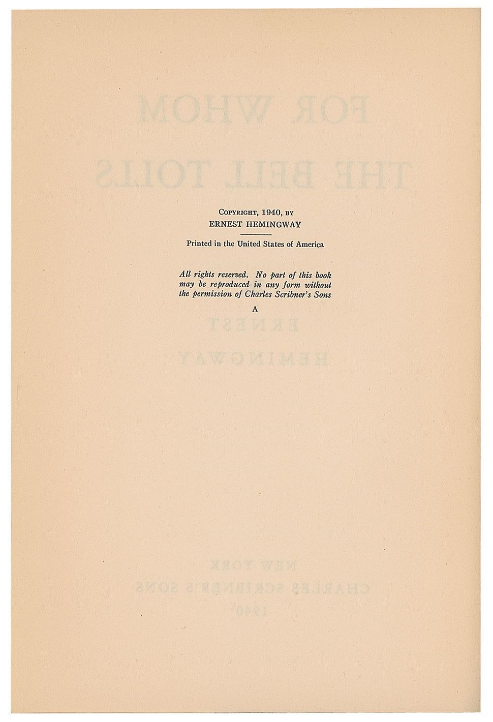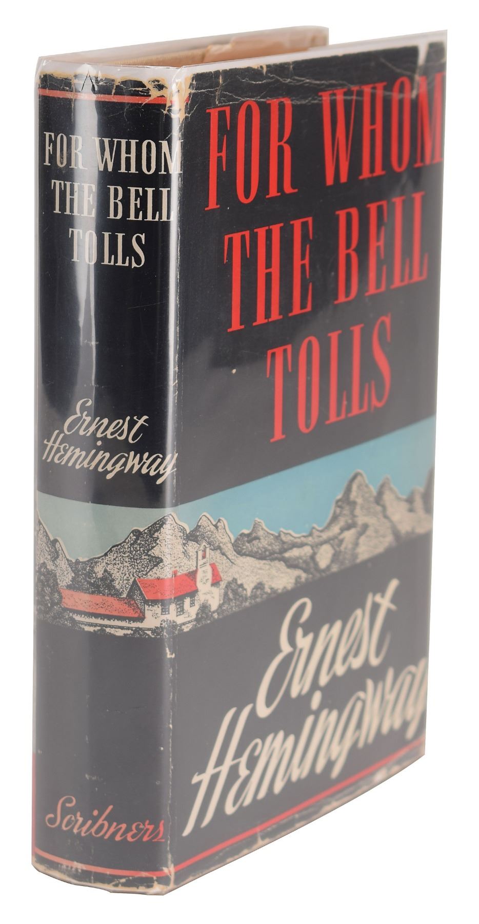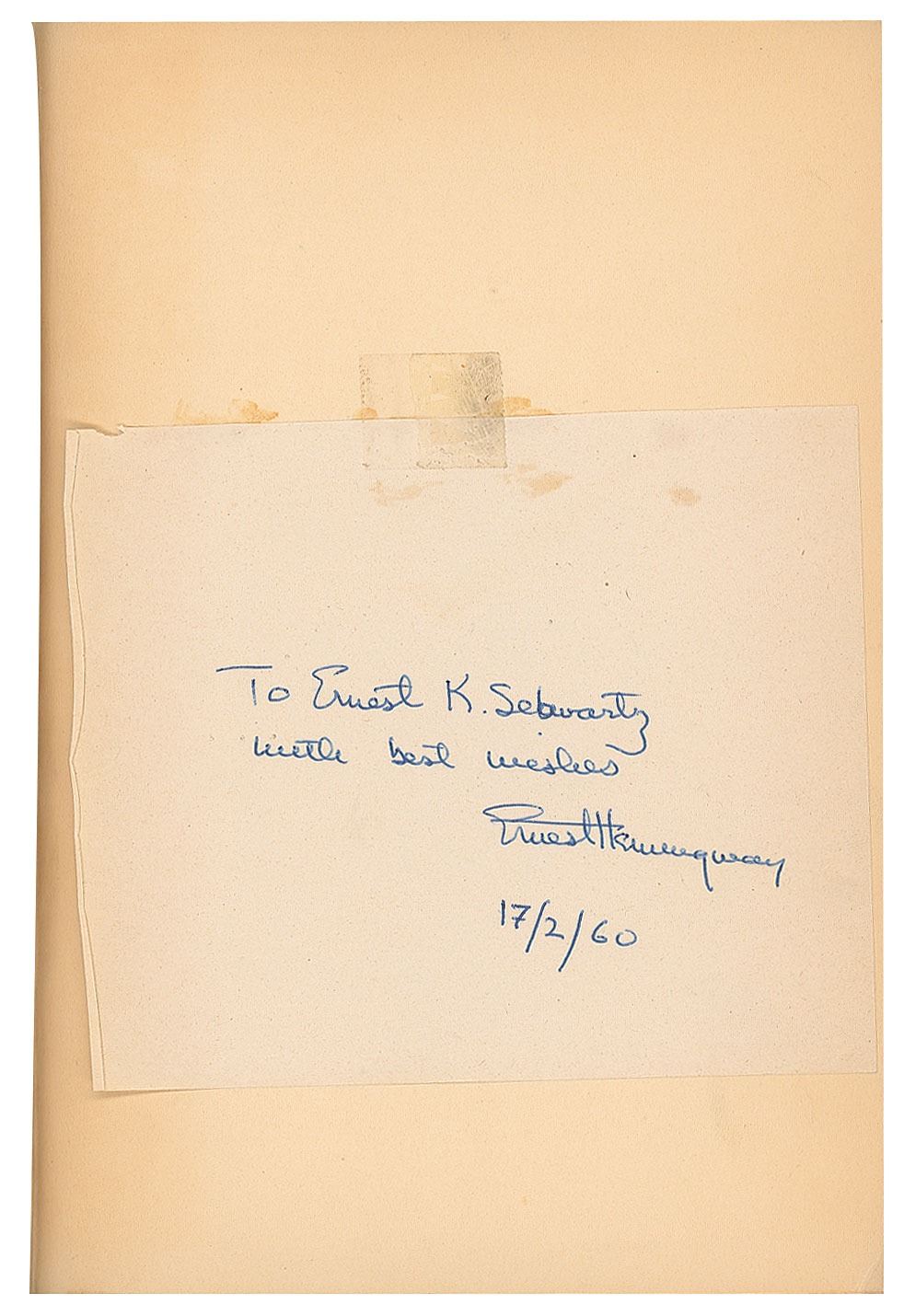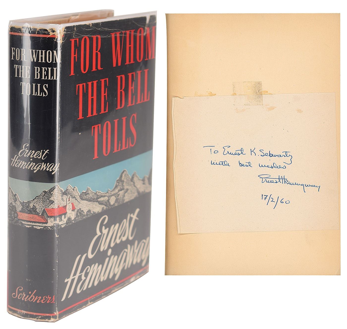 Signed book: For Whom the Bell Tolls. First edition. NY: Charles Scribner's Sons, 1940. Hardcover with dust jacket, 6 x 8.5, 471 pages. Signed and inscribed on a slip taped to the first free end page in blue ballpoint, "To Ernest K. Sebwartz, with best wishes, Ernest Hemingway, 17/2/60." Autographic condition: fine, with old glue stains, and a small piece of tape, to the top of the signed slip. Book condition: VG+/VG, with noticeable chips and creases to the dust jacket's edges.