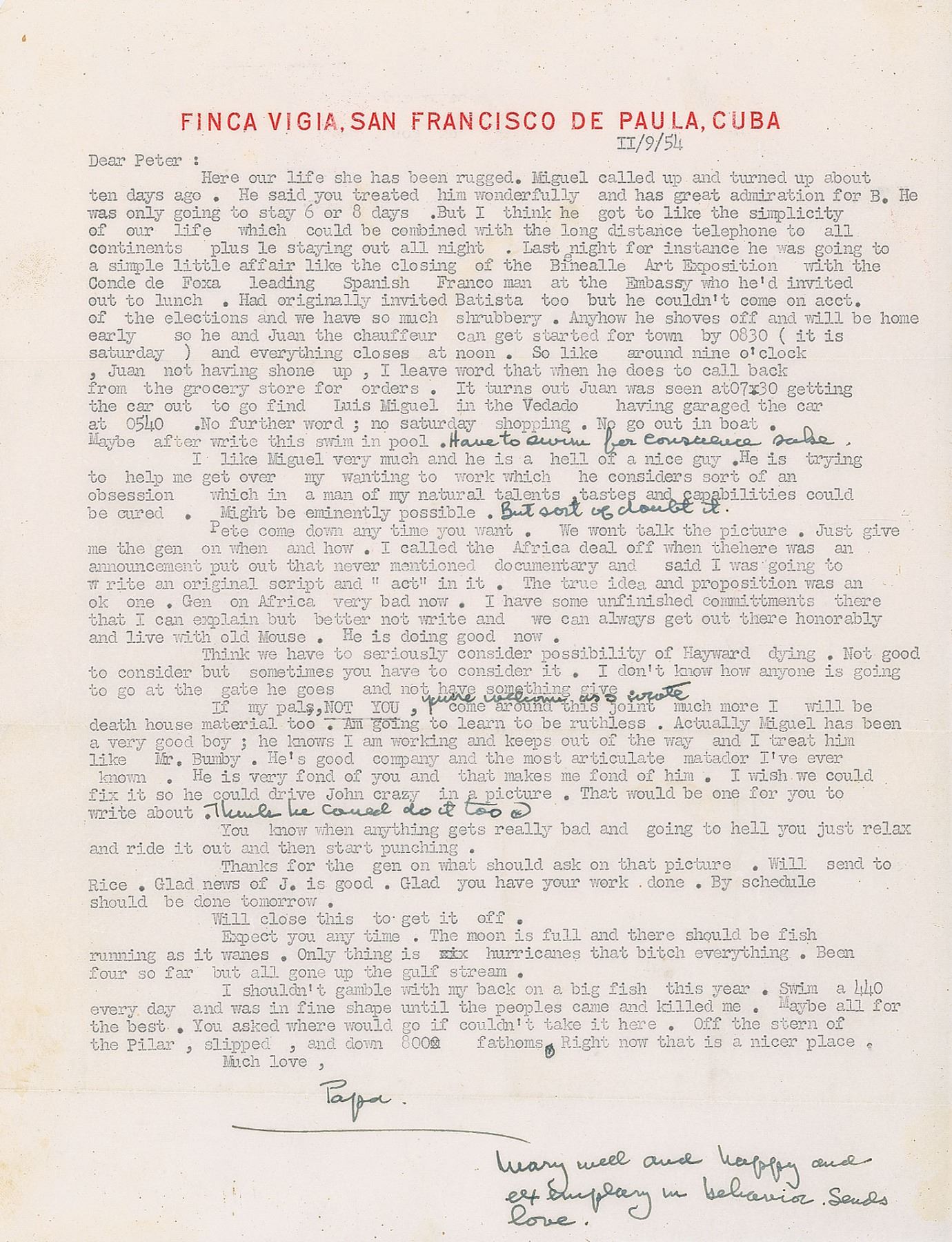 TLS signed “Papa,” one page, 8.5 x 11, Finca Vigia letterhead, February 9, 1954. Letter to novelist and screenwriter Peter Viertel, in part: "Here our life she has been rugged. Miguel called up and turned up about ten days ago. He said you treated him wonderfully and has great admiration for B. He was only going to stay 6 or 8 days. But I think he got to like the simplicity of our life which could be combined with the long distance telephone to all continents plus le staying out all night. Last night for instance he was going to a simple little affair like the closing of the Binealle Art Exposition with the Conde de Foxa leading Spanish Franco man at the Embassy who he'd invited out to lunch. Had invited Batista too but he couldn't come on acct. of the elections and we have so much shrubbery…Maybe after write this swim in pool. Have to swim for conscience sake. I like Miguel very much and he is a hell of a nice guy. He is trying to help me get over my wanting to work which he considers sort of an obsession which in a man of my natural talents tastes and capabilities could be cured. Might be eminently possible. But I sort of doubt it. Pete come down any time you want. We won't talk the picture. Just give me the gen on when and how. I called the Africa deal off when there was an announcement put out that never mentioned documentary and said I was going to write an original script and 'act' in it. The true idea and proposition was an ok one. Gen on Africa very bad now…