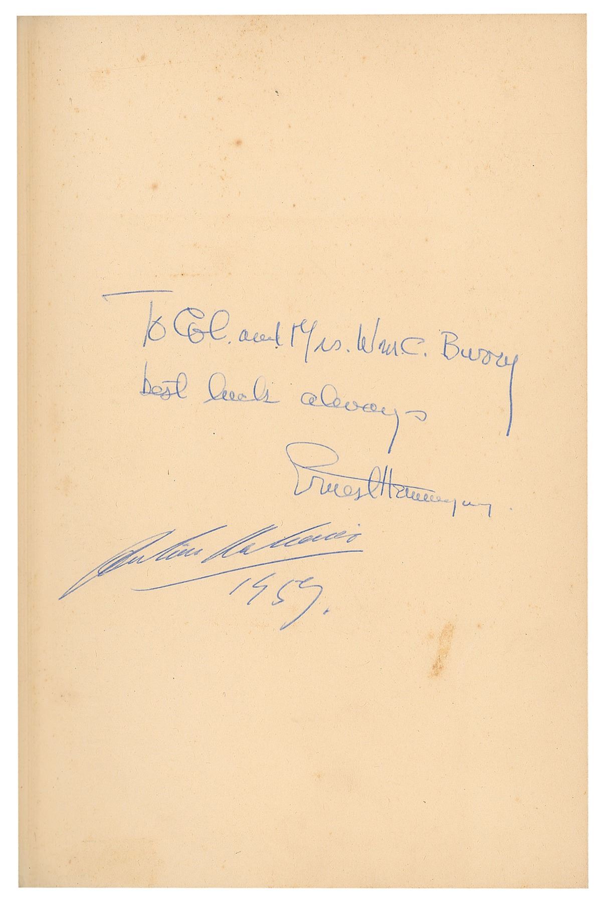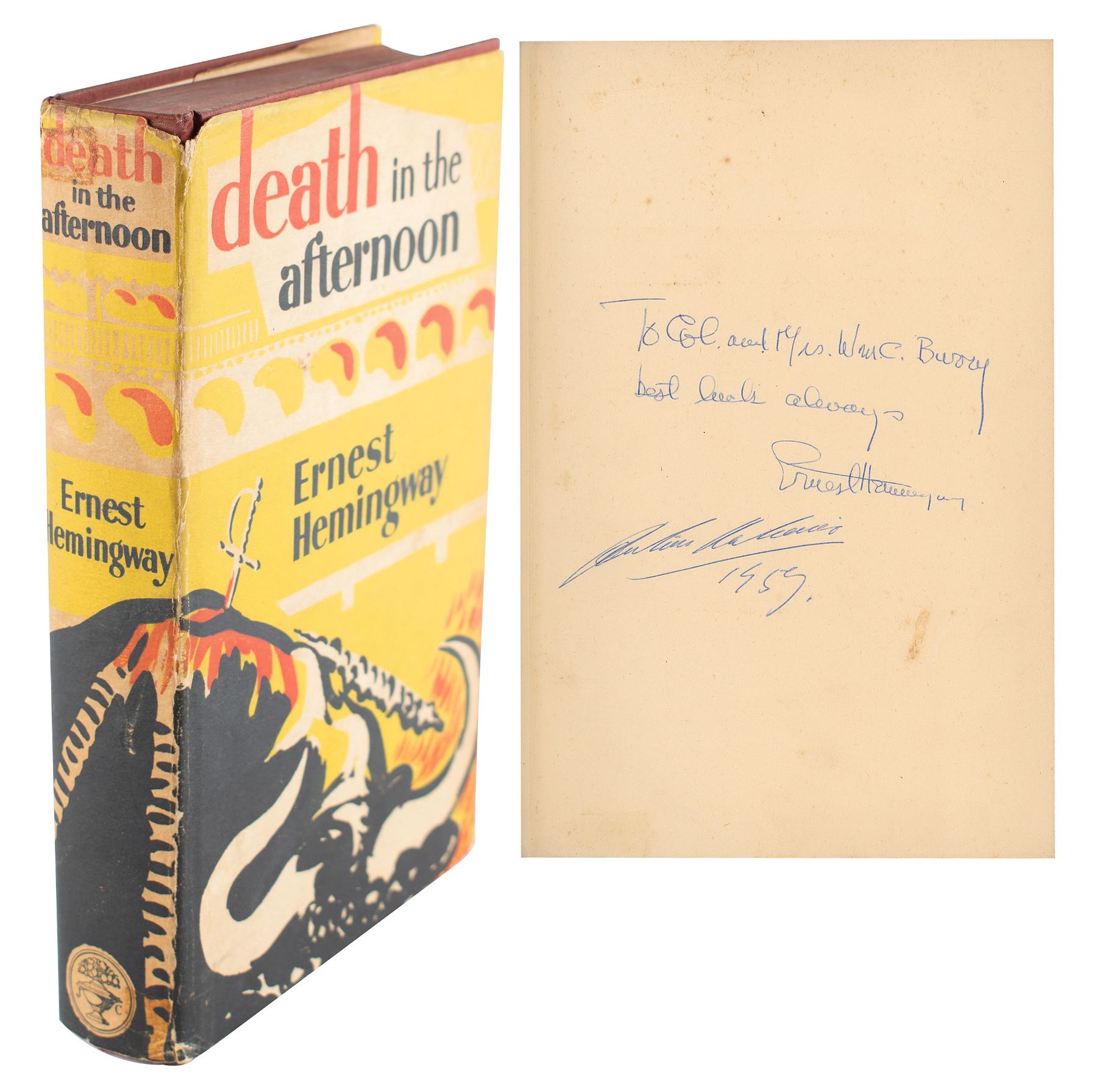 Signed book: Death in the Afternoon. Later printing. London: Jonathan Cape, 1956. Hardcover with dust jacket, 6 x 8.75, 358 pages. Signed and inscribed on the first free end page in blue ballpoint, "To Col. and Mrs. W. C. Burry, best luck always, Ernest Hemingway." The page is also signed by famed Spanish bullfighter Antonio Ordóñez, who is profiled in the book. Autographic condition: fine condition, with a few small stains to the signed page. Book condition: VG/VG, with foxing to fore-edge, edgewear to dust jacket, and a few splits to the jacket's spine ends repaired with old tape. Accompanied by a vintage newspaper clipping of Hemingway with Ordóñez.