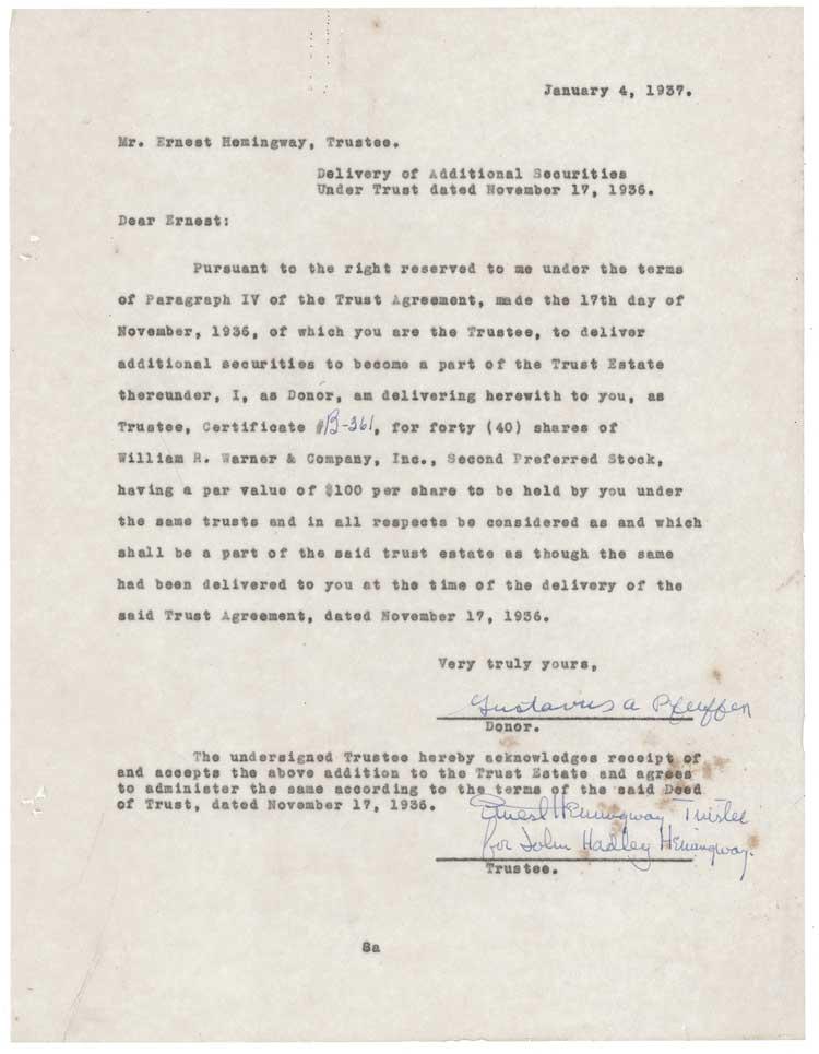 Carbon DS, signed in ink “Ernest Hemingway Trustee for John Hadley Hemingway,” one page, 8.5 x 11, January 4, 1937. Pfeiffer begins “Dear Ernest, Pursuant to the right reserved to me under the terms of Paragraph IV of the Trust Agreement, made the 17th day of November, 1936, of which you are the Trustee, to deliver additional securities to become part of the Trust Estate thereunder, I, as Donor, am delivering herewith to you, as Trustee, Certificate #B424, for twenty-three (23) shares of William R. Warner & Company, Inc., Second Preferred Stock, having a par value of $100 per share…” Hemingway “acknowledges receipt of and accepts the above addition to the Trust Estate and agrees to administer the same according to the terms of the said Deed of Trust, dated November 17, 1936.” Accompanied by a copy of the complete 14 page Deed of Trust, dated November 17, 1936, including a photocopy of this document and photocopies of three others signed by Hemingway. In fine condition, with a couple small tears to left edge, and some mild toning over signature areas. Pre-certified John Reznikoff/PSA/DNA and RRAuction COA.