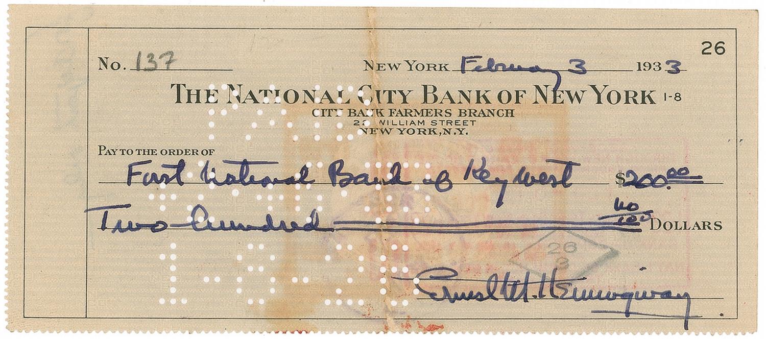 Bank check, 6.5 x 3, filled out and signed by Hemingway, payable to First National Bank of Key West for $200.00, February 3, 1933. In very good condition, with a central vertical fold, expected cancellation holes, and show-through from stamp on reverse, as well as a second stamp, affecting portion of signature. After his return home from safari Hemingway started writing The Green Hills of Africa. The book did not sell well at first, which depressed Hemingway, but his two major African short stories were quickly recognized to be among the highlights of his writings, ‘The Short Happy Life of Francis Macomber’ and ‘The Snows of Kilimanjaro.’