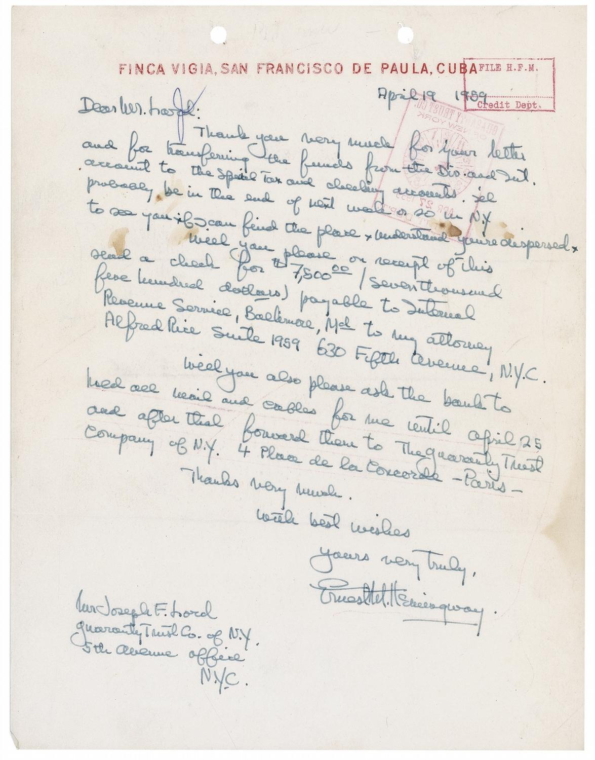 ALS, one page, 8.5 x 11, Finca Vigia letterhead, April 19, 1959. Letter to Joseph F. Lord, a representative of the Morgan Guarantee Trust Company regarding banking services. In full: “Thank you very much for your letter and for transferring the funds from the Div. and Int. Account to the special tax…accounts. I’ll probably be in the end of next week or so in N.Y. to see you if I can find the place & understand you’re dispersed.