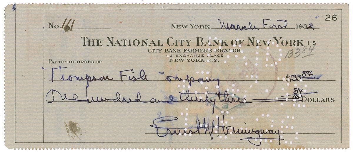Bank check, 6.5 x 2.75, filled out and signed by Hemingway, “Ernest W. Hemingway,” payable to Thompson Fish Company for $133.84, March 1, 1932. In very good condition, with cancellation holes and show-through from stamp on reverse affecting signature, a couple light brushes to signature, a bisecting vertical fold one through a single letter of signature, pencil notation to right side, and some light soiling and wrinkling. During his years in Key West, Hemingway befriended Charles Thompson, owner of Thompson Fish Company. When Hemingway went on a safari in 1933, Thompson went with him and became the inspiration for the character 'Old Karl' in Green Hills of Africa. Hemingway and Thompson were great friends for many years up until Hemingway's suicide in 1961.