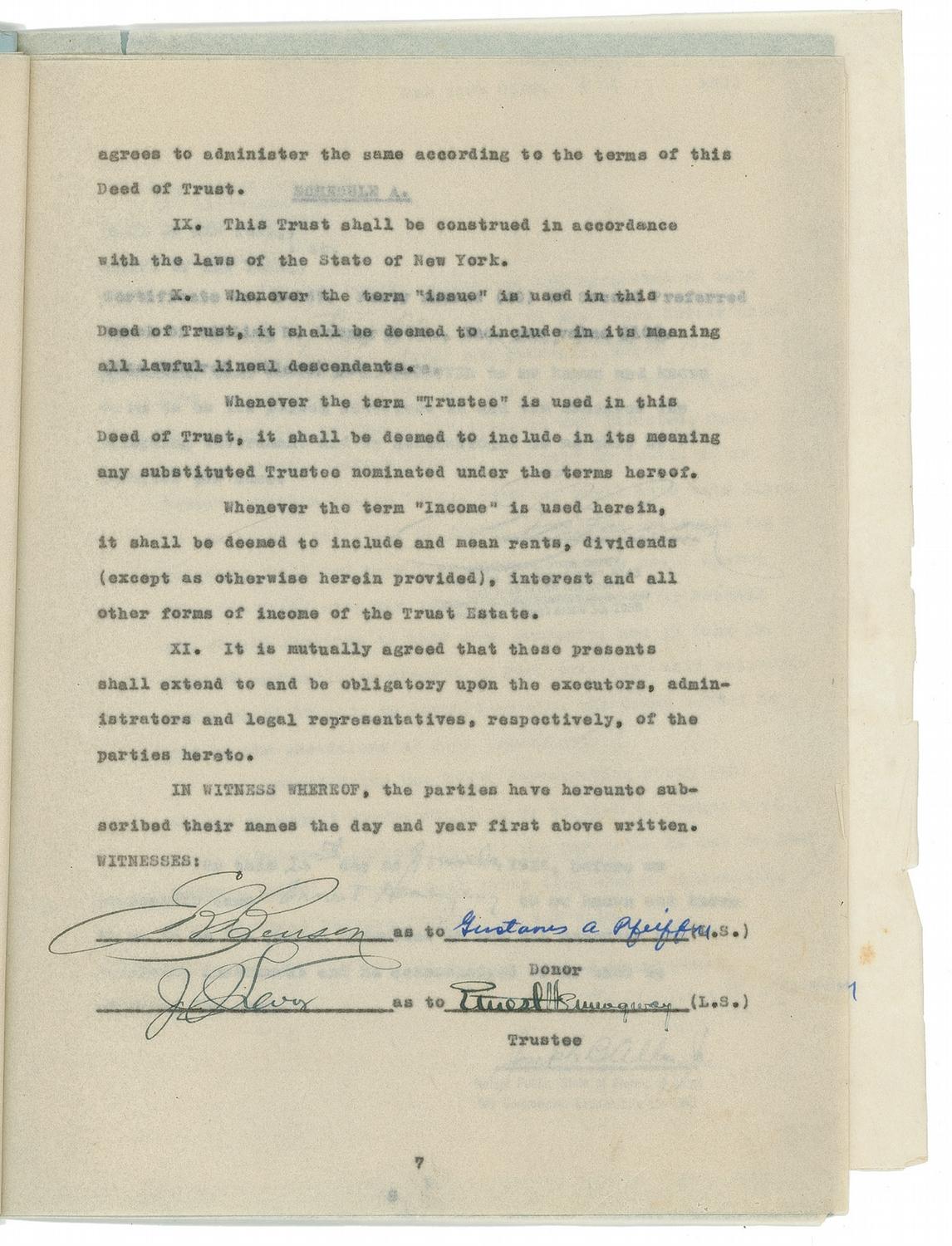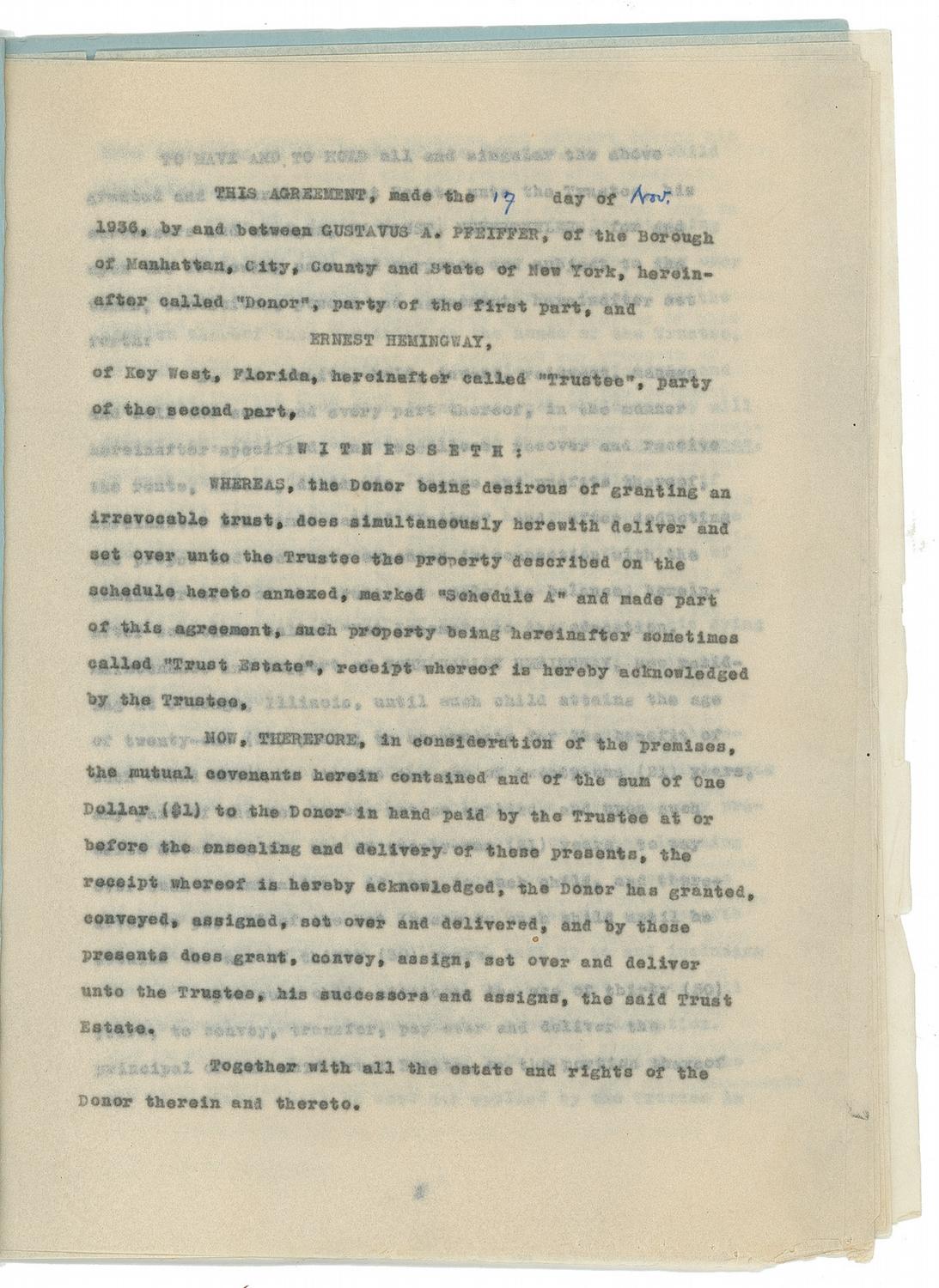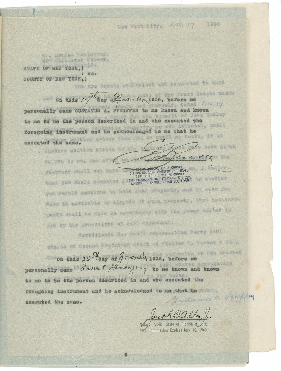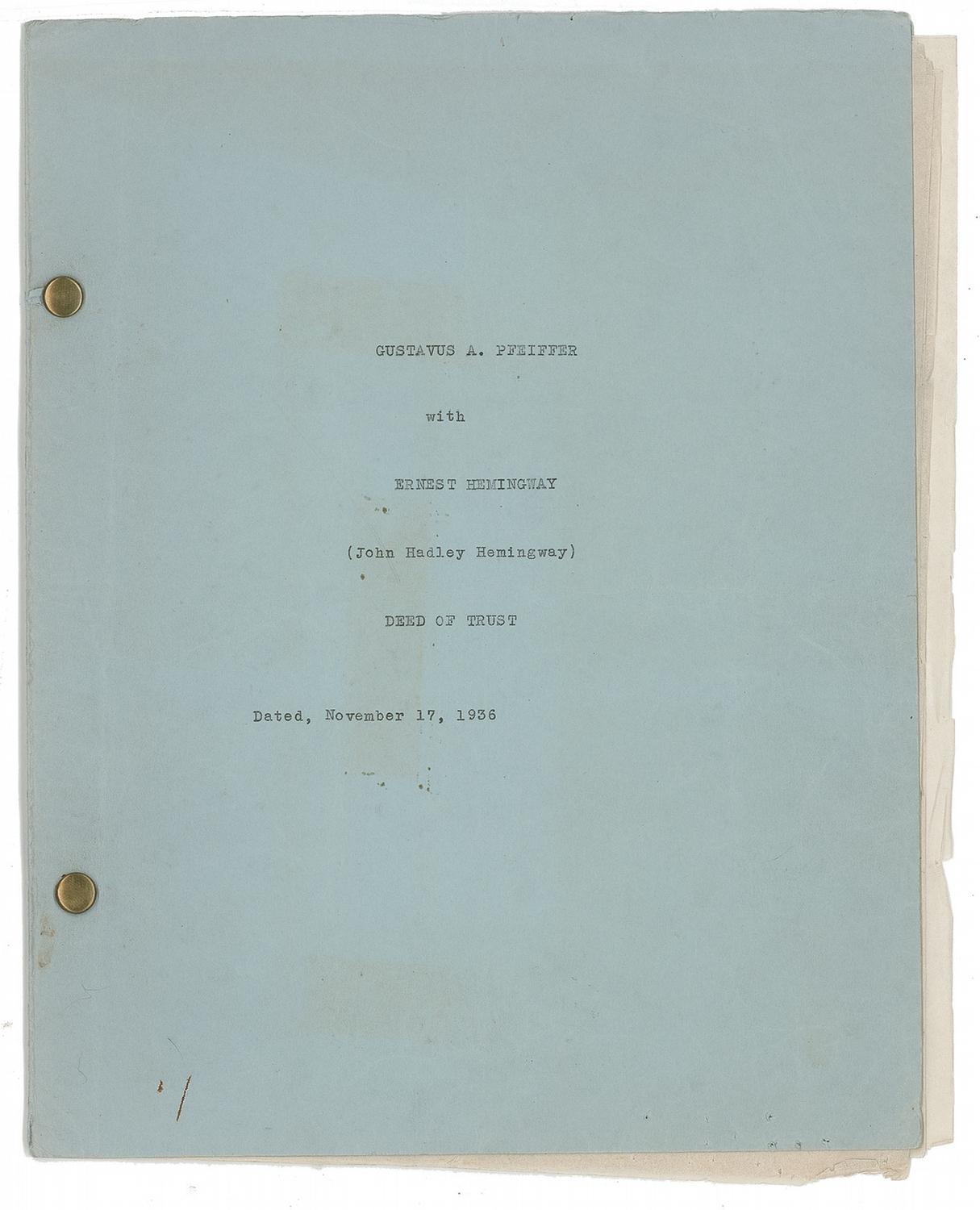 Carbon DS, signed in ink, “Ernest Hemingway,” nine onionskin pages, 8.5 x 11, November 17, 1936. Gustavus A. Pfeiffer, “the Donor, being desirous of granting an irrevocable trust,” delivers 40 shares of “Second Preferred Stock of William R. Warner & Co., Inc. par value $100” per share to Hemingway as Trustee. In 1908, Pfeiffer Pharmaceuticals had merged with William R. Warner & Co. The “Trust Estate” is to be used for “the education, maintenance and support of John Hadley Hemingway, now residing at Chicago, Illinois, until such child attains the age of twenty-one (21) years…any part of the Net Income not so applied…thereafter to pay all of the Net Income to such child until he attains the age of thirty (30) years…Upon such child attaining the age of thirty (30) years, to convey, transfer, pay over and deliver the principal of the said Trust Estate, or the portion thereof, then remaining in the hands of the Trustee, to such child absolutely…” Hemingway has “the power from time to time, in his discretion, to sell, endorse and reinvest or otherwise dispose of, any or all securities and property acquired under orb in accordance with the provisions of this Deed of Trust…” Present also is “Schedule A” identifying the stock as “Certificate No. B-267.” Also present is another page being a November 17, 1936, carbon TLS “Gustavus A. Pfeiffer” in ink to Hemingway in Key West, concerning the stock, beginning, “You are hereby authorized and requested to hold and to continue to hold, as a part of the Trust Estate under the Agreement between myself and yourself, dated Nov. 17, 1936, establishing a Trust for the benefit of John Hadley Hemingway, the following property, as now invested, until further written notice from me, or until my death, if no further written notice to the contrary shall have been given to you by me…” On the back cover, Hemingway has handwritten in pencil: “Complete Copy Bumby’s Trust Fund, 2 copies–Stock Certificates for 40-40-23-Shares, 22.” Accompanied by a photocopy of the complete 14-page Deed of Trust. In very good to fine condition, with expected mild handling and document wear, small edge tears and creases, and Hemingway’s last name a bit light due to reduced ink flow. According to a November 18, 1936 article in The Miami News newspaper, ‘Papa’ was in the Sunshine State at this time en route to his Key West home to work on his novel To Have and Have Not after spending three months on a Montana ranch. John ‘Bumby’ Hemingway was one of three sons to survive the novelist, and had been captured by German forces during World War II and held as a POW. He later pursued a business career and retired in 1967 to become an educator. He was the father of actresses Margaux and Mariel Hemingway.