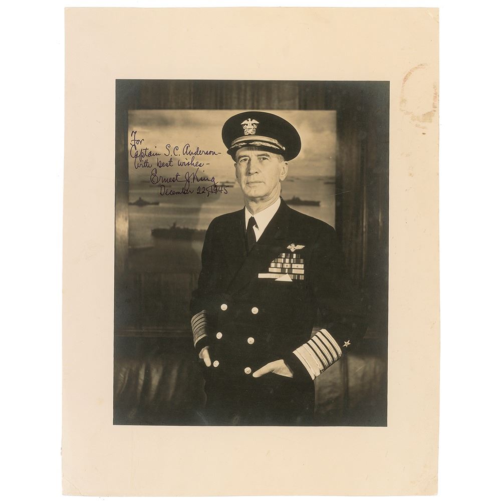Commander-in-chief of the US Fleet and chief of naval operations (1878-1956) who commanded the US Navy throughout World War II and served as President Franklin D. Roosevelt's chief naval advisor. He was promoted to five-star admiral in 1944. Dignified matte-finish 10.25 x 13.25 photo of Fleet Admiral King in uniform, signed and inscribed in black ink, "For Captain S. C. Anderson—With best wishes—Ernest J. King, December 22, 1945." In very good to fine condition, with light creasing and staining to the borders, and light silvering to the perimeter of the image.