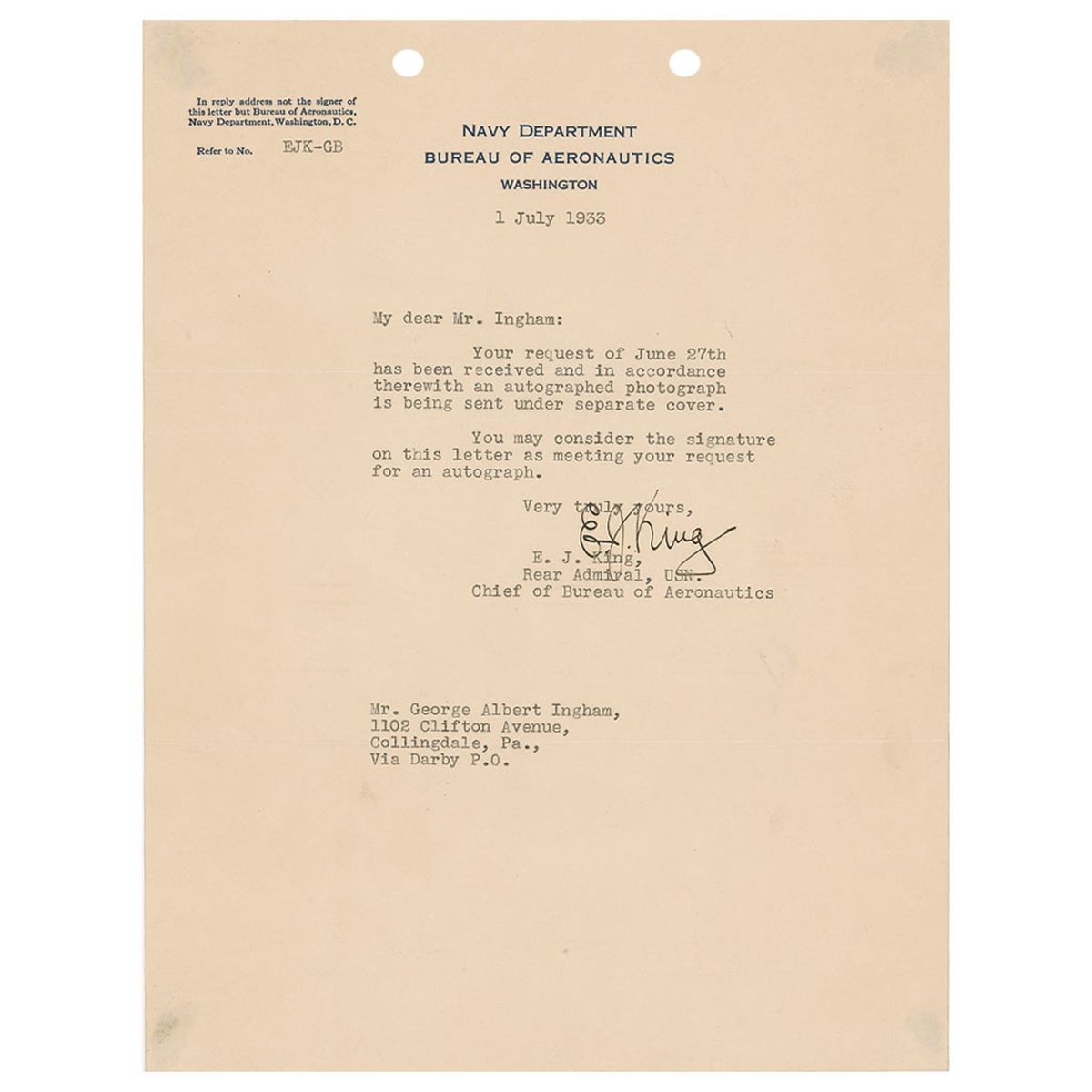 Commander-in-chief of the US Fleet and chief of naval operations (1878-1956) who commanded the US Navy throughout World War II and served as President Franklin D. Roosevelt’s chief naval advisor. He was promoted to five-star admiral in 1944. TLS signed “E. J. King,” one page, 8 x 10.25, Navy Department letterhead, July 1, 1933. Short letter to a collector. In part: “You may consider the signature on this letter as meeting your request for an autograph.” In fine condition, with two punch holes to top edge, light mounting remnants on reverse, and a uniform shade of toning.