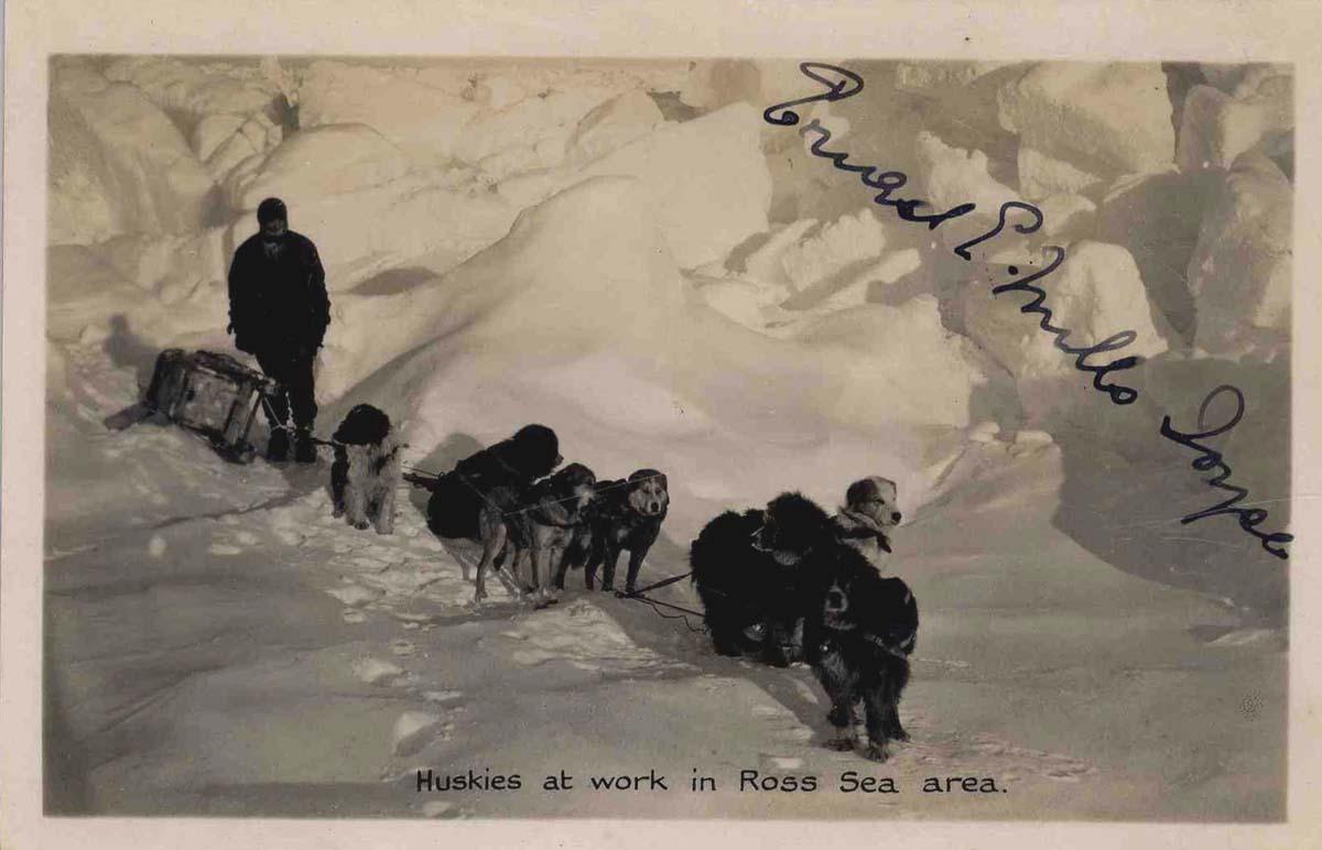 Ernest Mills Joyce signed postcard, ''Ernest E. Mills Joyce''. Postcard, measuring 5.5'' x 3.5'', shows a pack of huskies and reads, ''Huskies at work in the Ross Sea area.'' Joyce was a part of the Ross Sea Party crew during the extraordinary Shackleton expedition and received an Albert Medal for his actions in bringing the stricken party to safety after a traumatic journey on the Great Ice Barrier. Near fine condition with prominent signature in black ink.