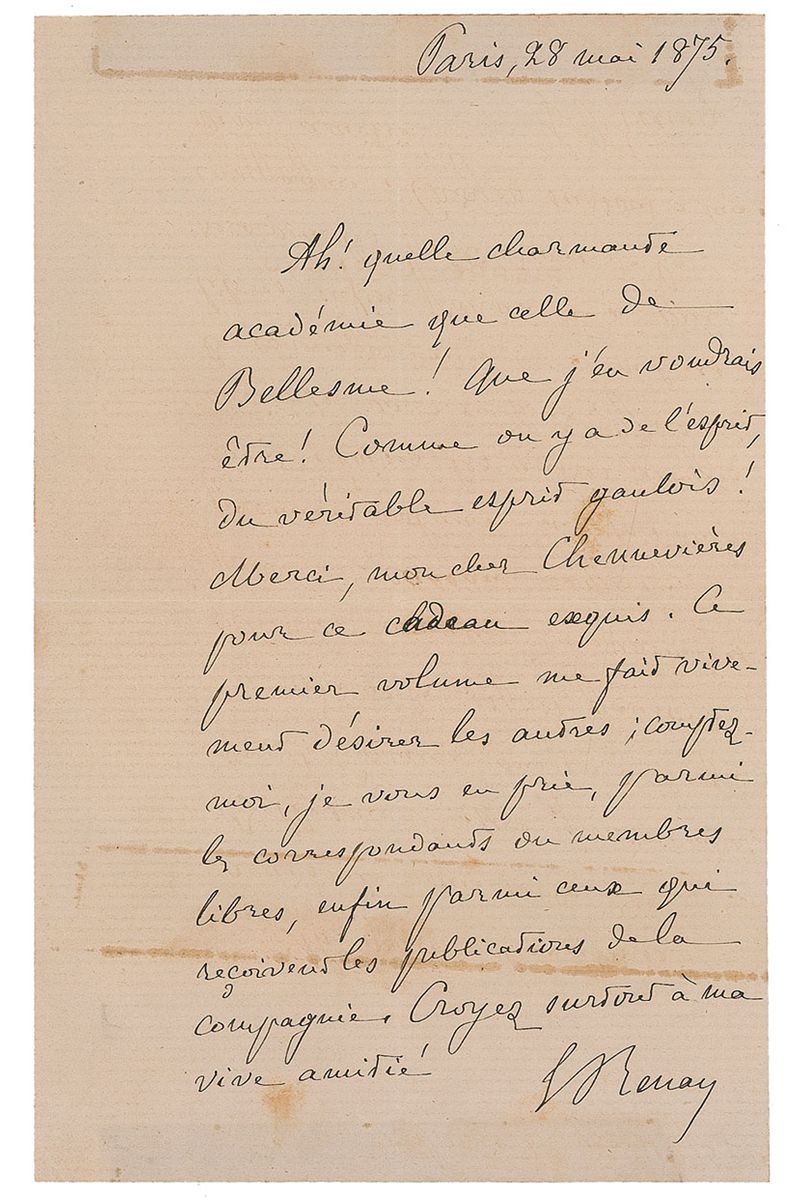 French philosopher and philologist (1823–1892) who authored the controversial book Life of Jesus. ALS in French, signed “E. Renan,” one page, 5.25 x 8.25, May 28, 1875. Untranslated letter to an unidentified recipient. In very good condition, with intersecting folds, and some areas of toning and staining from tape remnants on second integral page.