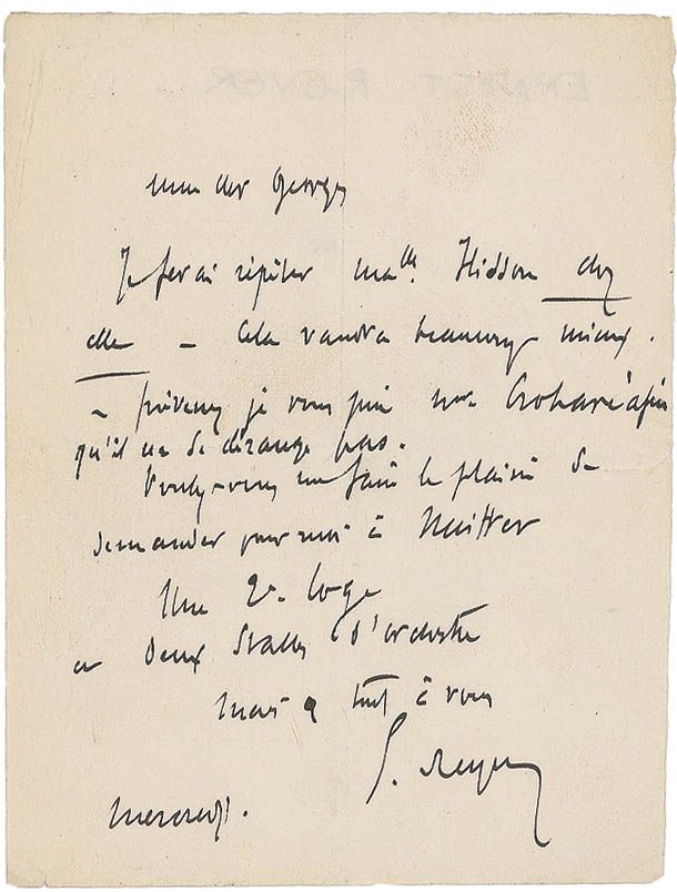 French opera composer and critic (1823–1909). ALS in French, signed “E. Reyer,” one page, lightly-lined graph-like paper, 4 x 5.25, March 9. Untranslated letter to George. In fine condition, with central horizontal and vertical fold and some scattered light toning.