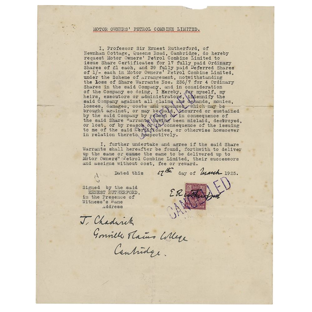 Scarce DS, signed “E. Rutherford" and "J. Chadwick, Gonville Caius College, Cambridge,” one page, 8.25 x 10.25, March 17, 1925. Directive issued to "Motor Owners' Petrol Combine Limited," in part: "I, Professor Sir Ernest Rutherford, of Newnham Cottage, Queens Road, Cambridge, do hereby request Motor Owners' Petrol Combine Limited to issue Share Certificates for 17 fully paid Ordinary Shares of £1 each, and 39 fully paid Deferred Shares of 1/- each in Motor Owners' Petrol Combine Limited, under the Scheme of Arrangement.” Signed and dated in bold fountain pen at the conclusion by Rutherford, and countersigned as a witness by James Chadwick. In fine condition, with scattered light foxing.