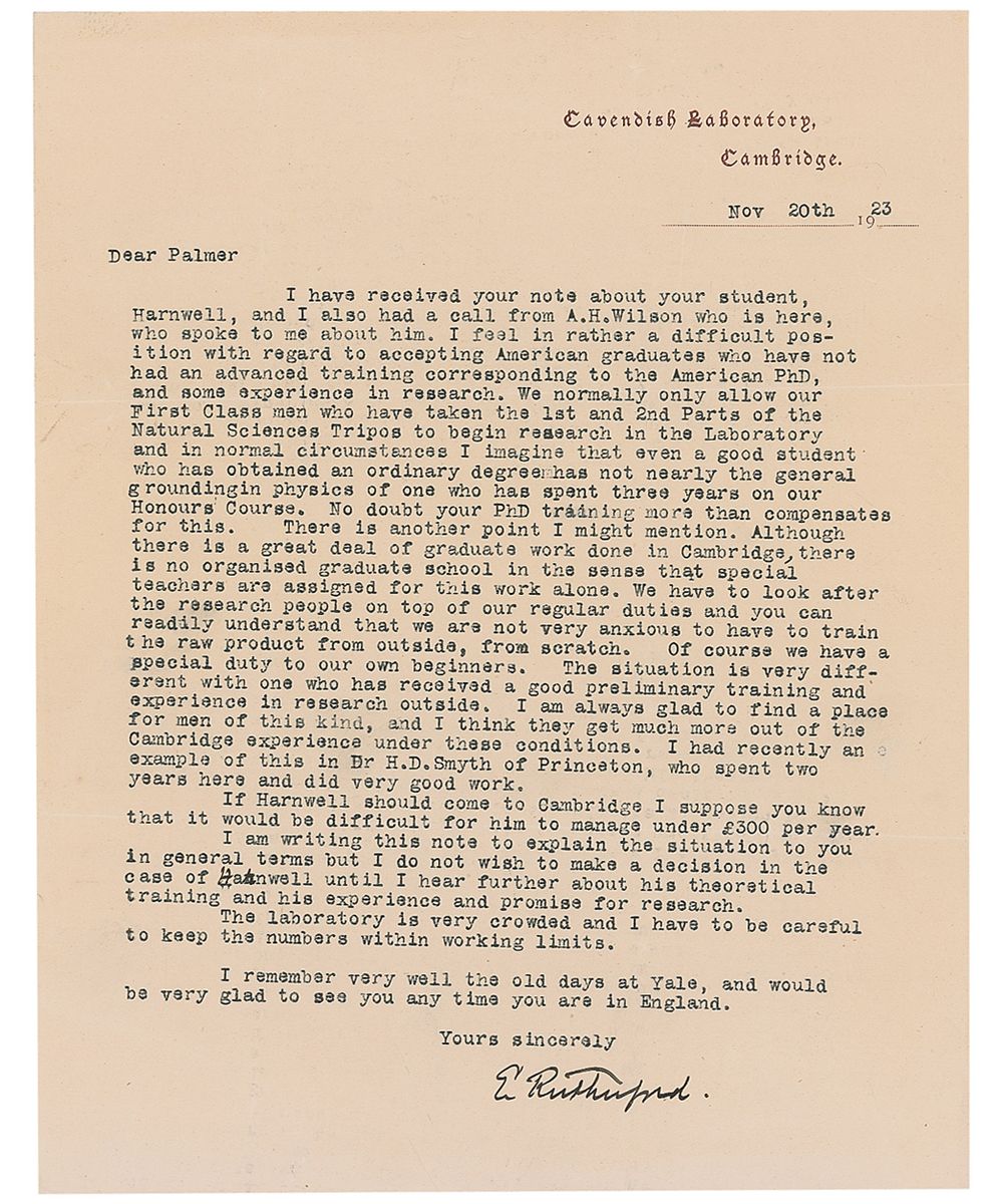 TLS signed “E. Rutherford,” one page, 8 x 10, Cavendish Laboratory, Cambridge letterhead, November 20, 1923. Letter to a colleague regarding admissions of one of his students. In part: “I feel in rather a difficult position with regard to accepting American graduates who have not had an advanced training corresponding to the American PhD, and some experience in research…in normal circumstances I imagine that even a good student who has obtained an ordinary degree has not nearly the general grounding in physics of one who has spent three years on our Honours Course. No doubt your PhD training more than compensates for this…We have to look after the research people on top of our regular duties and you can readily understand that we are not very anxious to have to train the raw product from outside, from scratch…The situation is very different with one who has received a good preliminary training and experience in research outside. I am always glad to find a place for men of this kind, and I think they get much more out of the Cambridge experience under these conditions…The laboratory is very crowded and I have to be careful to keep the numbers within working limits.” In fine condition, with intersecting folds, one vertical fold passing through a single letter of the signature, light scattered creases, and a light uniform shade of toning. A fascinating letter about university politics from the atomic pioneer.