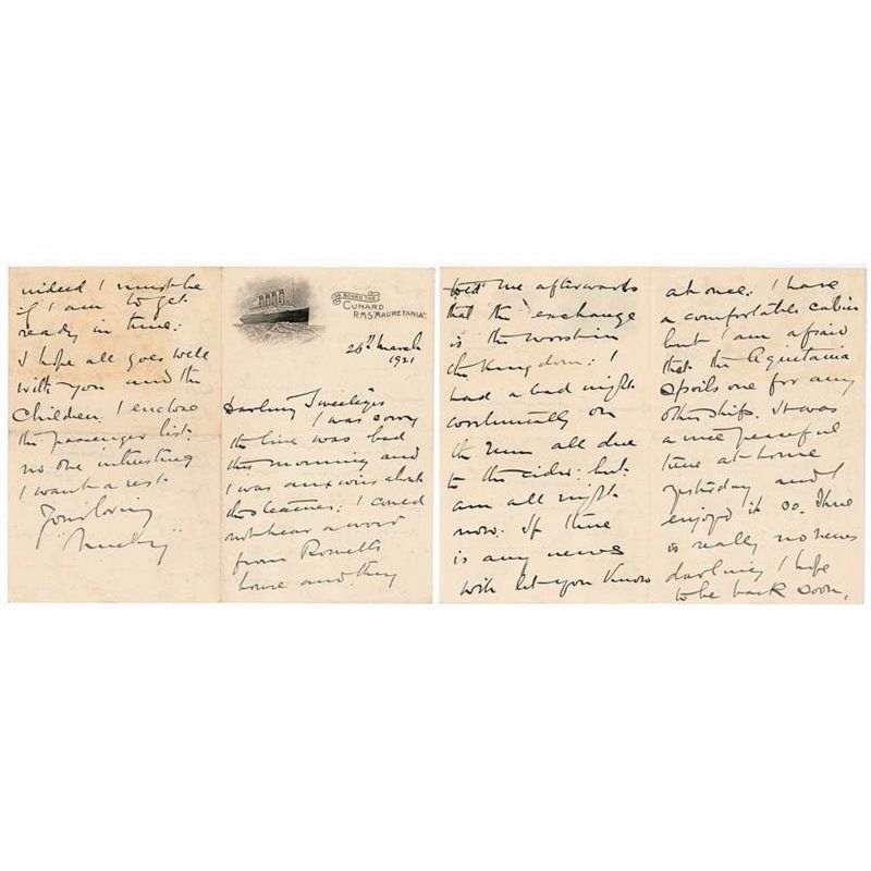 "Darling Sweeteyes, I was sorry the line was bad this morning and I was anxious about the lectures. I could not hear a word from Rowetts house and they told me afterwards that the exchange is the worst in the kingdom. I had a bad night continually on the run all due to the cider, but am all right now. If there is any news will let you know at once. I have a comfortable cabin but I am afraid that the Aquitania spoils one for any other ship. It was a wee peaceful time at home yesterday and I enjoyed it so. There is really no news darling. I hope to be back soon, indeed I must be if I am to get ready in time. I hope all goes well with you and the children. I enclose the passenger list. No one interesting. I want a rest. Your loving, Micky".