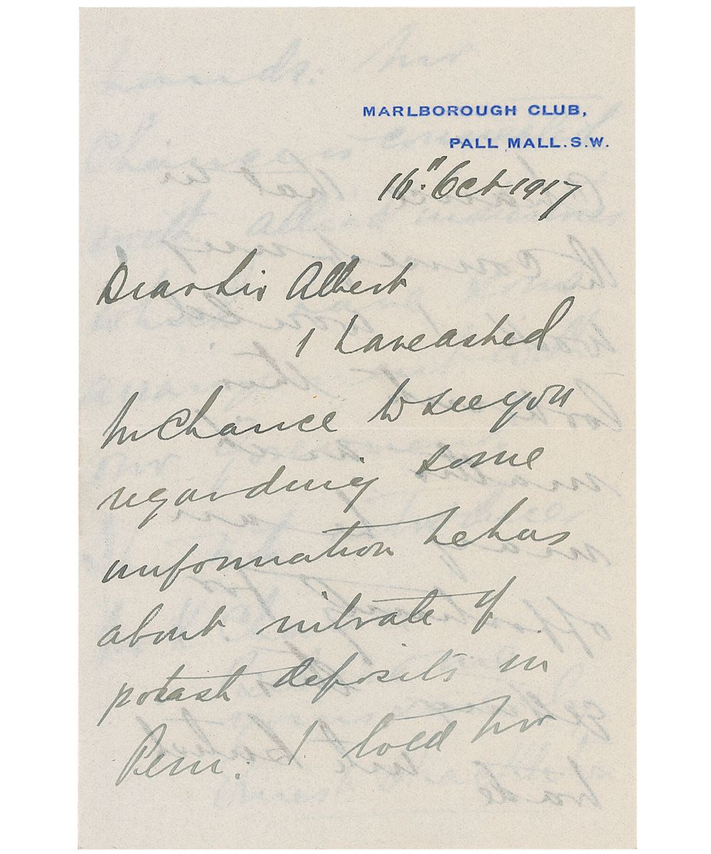 Shackleton had returned to England in May 1917 following the conclusion of his Imperial Trans-Antarctic Expedition. Despite being too old for conscription and suffering a heart condition, Shackleton volunteered for the army and repeatedly asked to be sent to the front in France. Instead, he was sent to Buenos Aires to drum up support for Britain in South America, departing just one day after writing this letter. Here, he writes to Sir Albert Stanley, a member of Parliament and president of the Board of Trade, regarding Kenneth Chance, an innovator in potash production, and potash deposits in Peru. Shackleton’s diplomatic mission to South America was largely unsuccessful and failed to persuade neutral Argentina and Chile to enter the war on the side of the Allies.