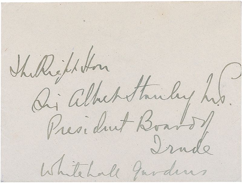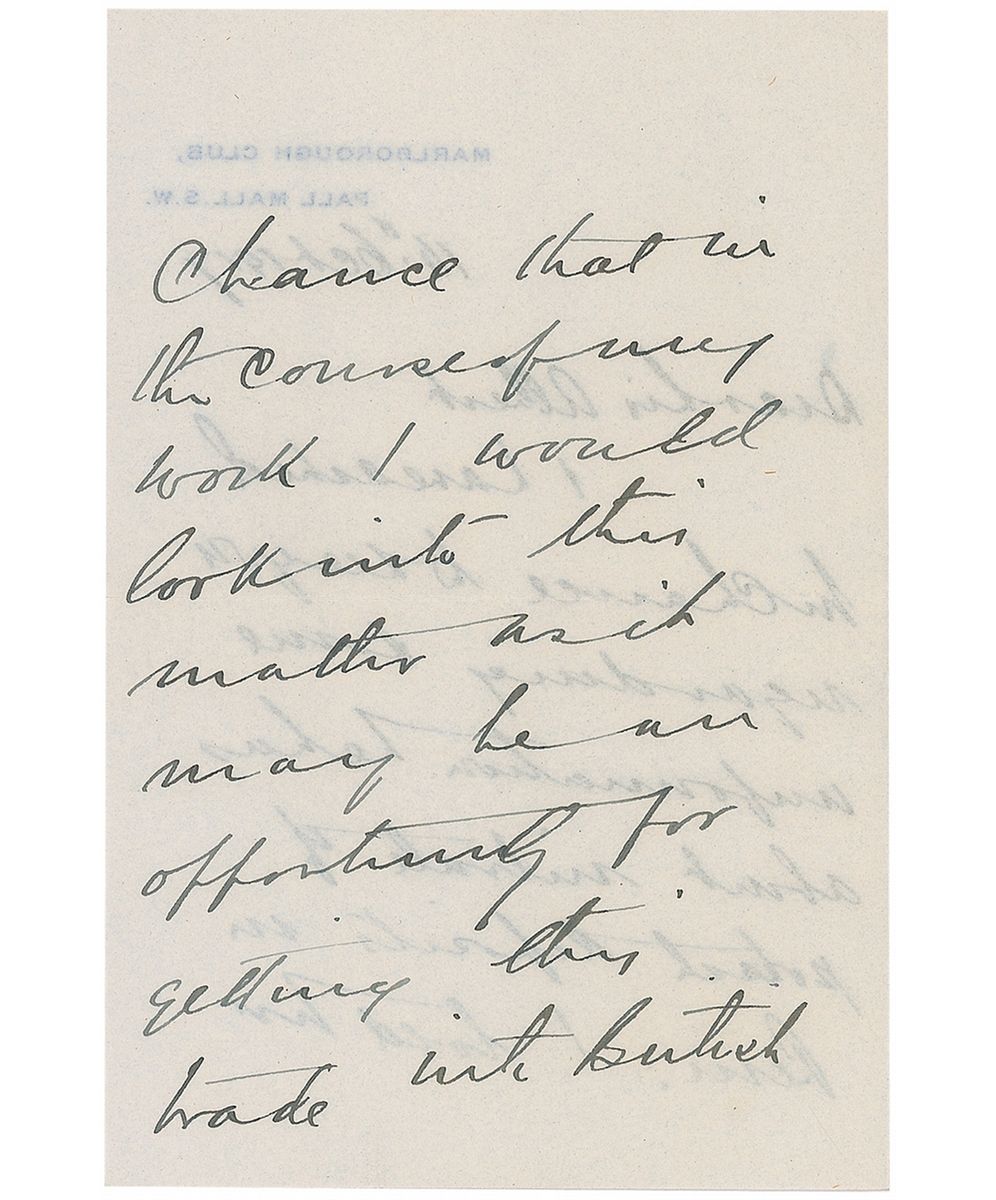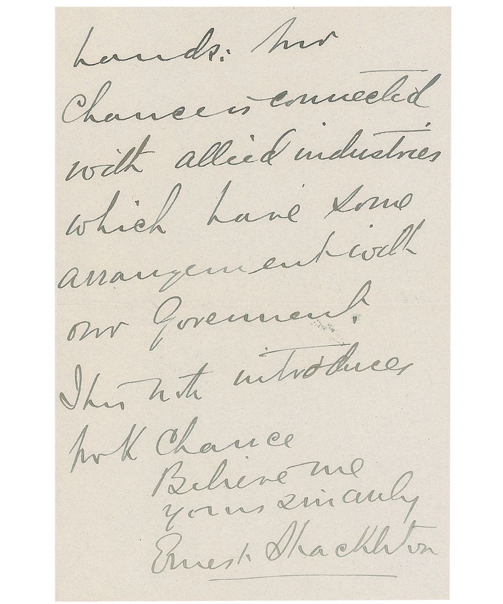 Shackleton (1874–1922), a junior officer in Scott’s National Antarctic Expedition of 1901–02, nearly reached the South Pole during an expedition of his own in 1909, in the process becoming a national hero. In 1915, during another expedition, his ship, Endurance, was crushed in the polar ice, and he and five others made a perilous journey of 1300 miles to bring relief for the crew. Knighted in 1909, Shackleton died at South Georgia during a fourth expedition in 1922. ALS, three pages on two adjoining sheets, 4 x 6, Marlborough Club letterhead, October 16, 1917. Letter to Sir Albert Stanley. In full: “I have asked Mr. Chance to see you regarding some information he has about nitrate of potash deposits in Peru. I told Mr. Chance that in the course of my work I would look into this matter as it may be an opportunity for getting this made with British hands: Mr. Chance is connected with allied industries which have some arrangement with our Government. I herewith introduce Mr. K. Chance.” In fine condition. Accompanied by the original transmittal envelope, addressed by Shackleton, “The Right Hon Sir Albert Stanley M.P., President Board of Trade, Whitehall Gardens,” which was personally delivered to Stanley by Chance.