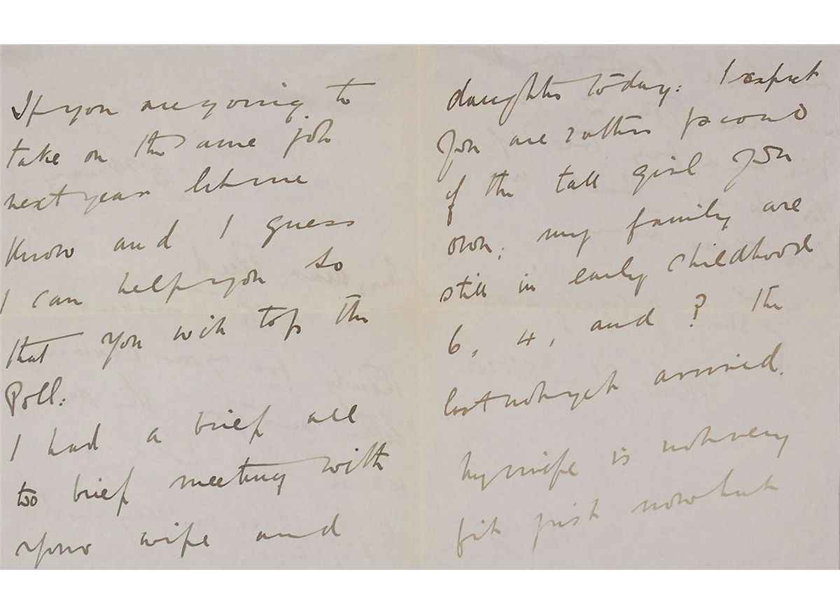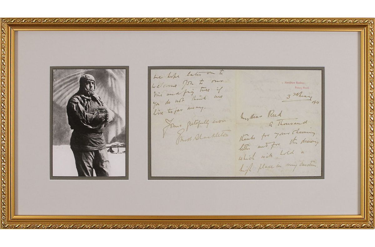 ALS, four pages on two adjoining sheets, 5 x 6.5, personal letterhead, May 3, 1911. Letter to English caricaturist Edward Tennyson Reed. In full: “A thousand thanks for the drawing which will hold a high place in my sanctum. If you are going to take on that one job next year let me know and I guess I can help you so that you will top the poll. I had a brief all too brief meeting with your wife and daughter today. I expect you are most proud of the tall girl you own; my family are still in early childhood, 6, 4, and ? the last not yet arrived. My wife is not very fit just now but we hope later on to welcome you to our vine and fig tree if you do not think we live too far away.” Matted and framed (so all pages may be viewed) with a portrait of Shackleton to an overall size of 22 x 12.25. In fine condition, with a bit of mild toning to first page.