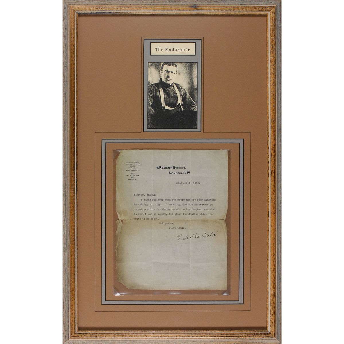 TLS signed “E. H. Shackleton,” one page, 8 x 10, personal letterhead, April 22, 1912. Letter to Mr. Knight. In full: “I thank you very much for yours and for your kindness in writing so fully. I am sorry that Mrs. Hailes-Dutton cannot get in under the terms of the Institution, and will do what I can as regards the other Institution which you write to me about.” Double-matted and framed with a small image to an overall size of 16 x 25. In very good condition, with intersecting folds, one through a single letter of signature, some edge tears and paper loss, and scattered soiling. Oversized.