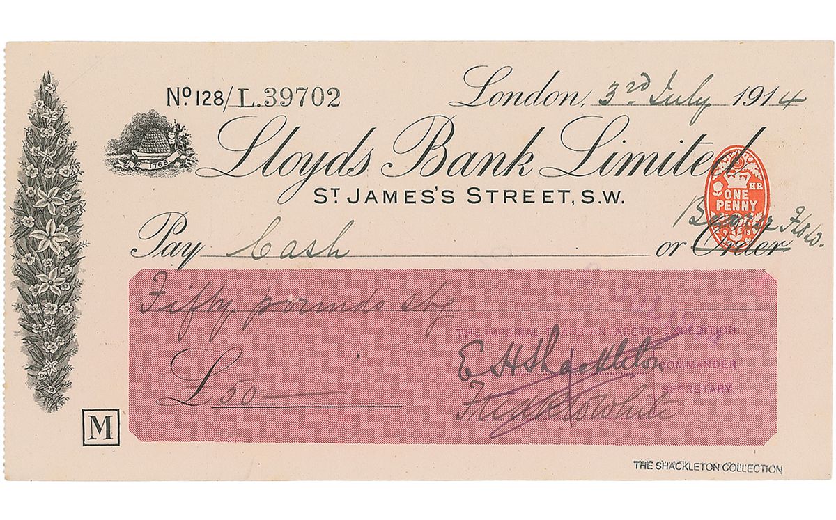 Bank check, 8.25 x 4.5, filled out in another hand and signed by Shackleton, “E. H. Shackleton,” payable to Cash for £50.0.0, July 3, 1914. Check is also signed by secretary Frank W. White, who has also crossed out “order,” and written, “Bearer F. W. W.” Check is stamped at the bottom, “The Shackleton Collection.” In fine condition, with a small pinhole to body, and an ink cancellation passing through signature.