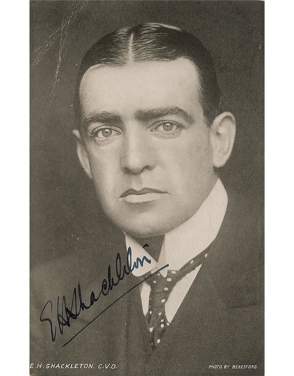 Uncommon 3.5 x 5.5 postcard photo of Shackleton in a formal head-and-shoulders pose, boldly signed in black ink, “E. H. Shackleton.” Noticeable creasing to upper left corner, otherwise fine condition.