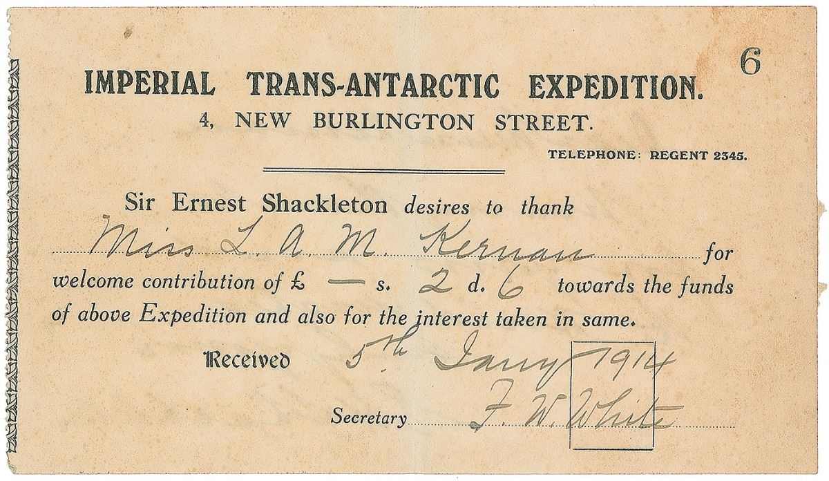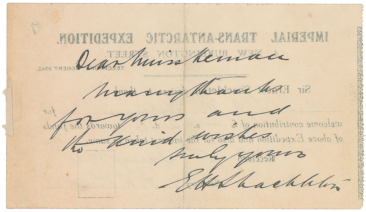 ANS signed “E. H. Shackleton,” one page, 6.5 x 3.75, January 5, 1914. Brief note of thanks written on the reverse of a partly-printed thank you note for a donation towards his Imperial Trans-Antarctic Expedition. The partly-printed note is signed by Secretary F. W. White, with Shackleton writing on the reverse, “Many thanks for yours and the kind wishes.” A central vertical fold passing through first initial of signature, and scattered light toning, a bit heavier to pre-printed side, otherwise fine condition.