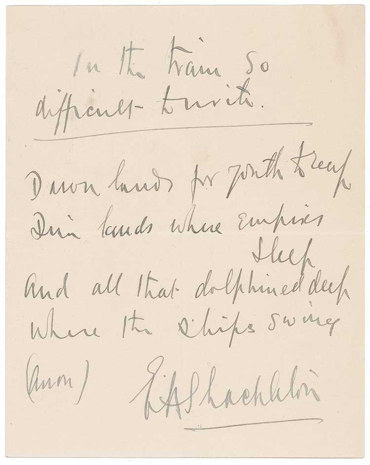 AQS on a 5 x 6.5 off-white sheet, signed “E. A. Shackleton.” Shackleton writes the final verse from “God Save the King”, “Dawn lands for youth to reap, Dim Lands where empires sleep, And all that dolphined deep, Where the ships swing.” At the top of the page, Shackleton explains his slightly shaky writing, “In the train so difficult to write.” In fine condition, with a central horizontal fold, a hint of light toning, and mounting remnants to second integral page.