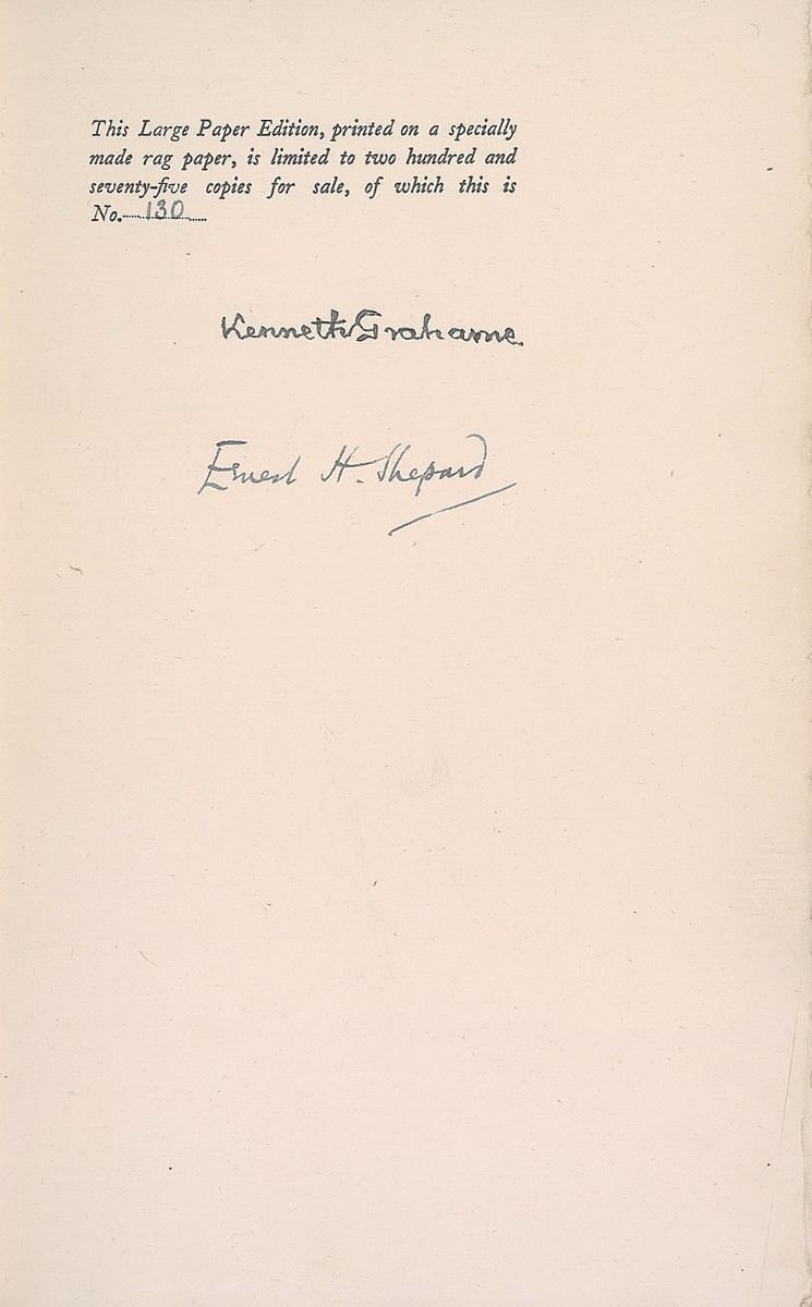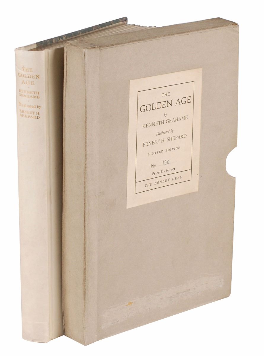Signed book: The Golden Age. First edition, limited issue, numbered 130/275. London: John Lane, The Bodley Head, 1928. Hardcover with slipcase, 6.25 x 9, 166 pages. Signed on the colophon in fountain pen by the author, “Kenneth Grahame,” and illustrator, “Ernest H. Shepard.” In fine condition, with a bookplate affixed to front pastedown, toning to free end pages, and some scuffing at the bottom of the slipcase. Grahame is best known for the children’s classic The Wind in the Willows, which was also illustrated by Shepard although he is better known as the illustrator of Winnie-the-Pooh.
