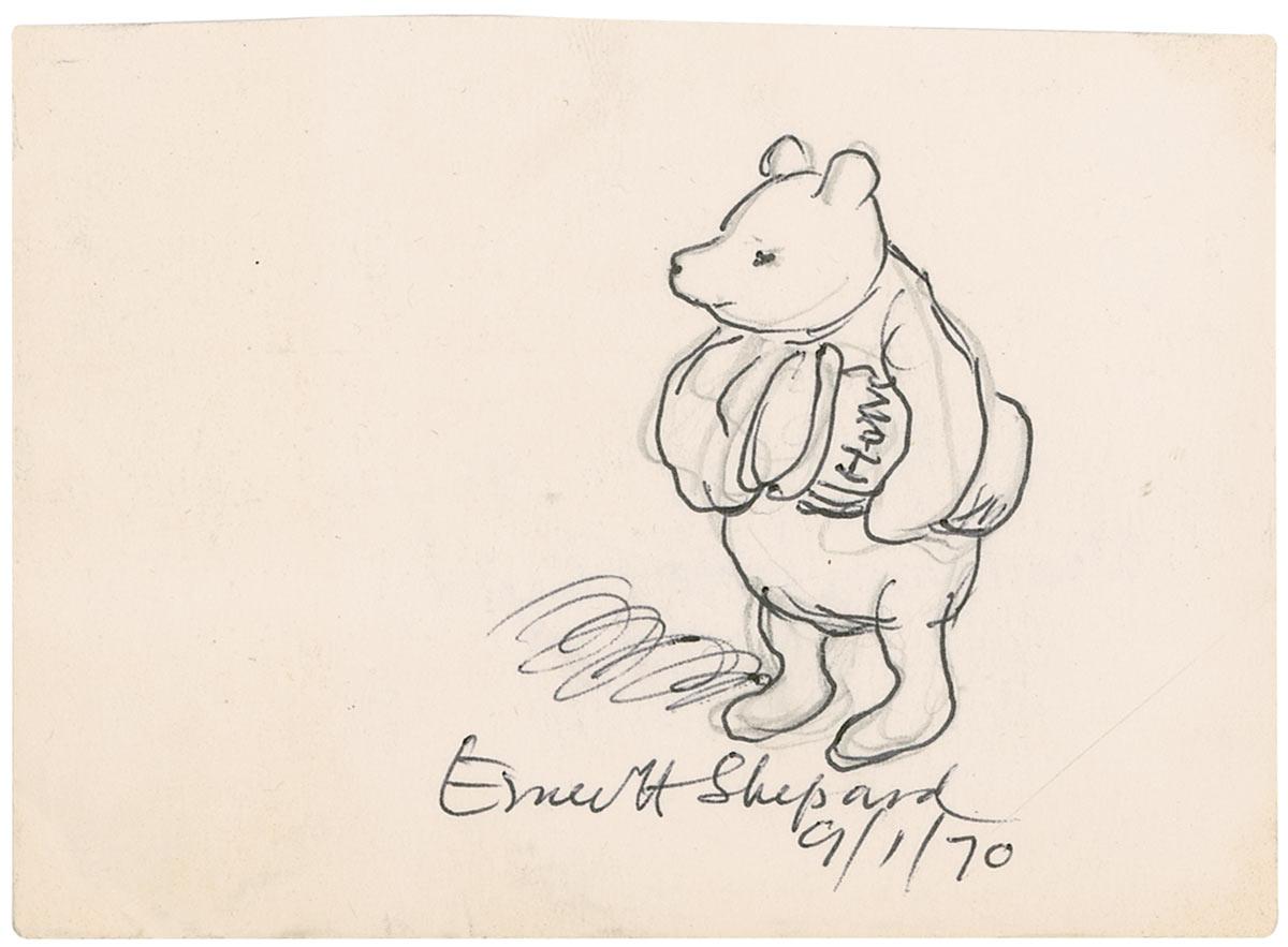 English artist and book illustrator (1879–1976) known especially for his human-like animals in illustrations for Winnie-the-Pooh by A. A. Milne. Extremely rare original signed pencil and ballpoint sketch of Winnie the Pooh holding a jar of honey under one arm and reaching into the jar with the other on an off-white 4 x 3 card, signed underneath “Ernest H. Shepard 9/1/70.” In fine condition, with neatly trimmed upper edge, and scattered faint toning. Winnie the Pooh sketches by Shepard are quite scarce as he famously regretted illustrating the A. A. Milne books as he felt that they overshadowed his subsequent career.