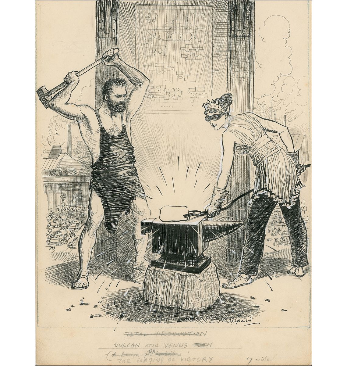 English artist and book illustrator (1879–1976) known especially for his human-like animals in illustrations for Winnie-the-Pooh by A. A. Milne. Original oversized vintage ink drawing on an off-white 10.5 x 14 sheet, affixed to a same size cardstock mount. Photo shows Vulcan and Venus hammering molten metal on an anvil, with a blueprint of a tank hanging in the background, and faint images of tanks and airplanes in the distance, signed at the bottom of the image, “E. H. Shepard.” Work was titled at the bottom in pencil, “Total Production,” but crossed out and replaced with “Vulcan and Venus or The Forging of Victory.” Light pencil border around image and some scattered light soiling, otherwise fine condition. Accompanied by a photocopy of the image as it appeared in Punch in 1941. A most decidedly different subject matter than usually found in Shepard drawings when they are available.