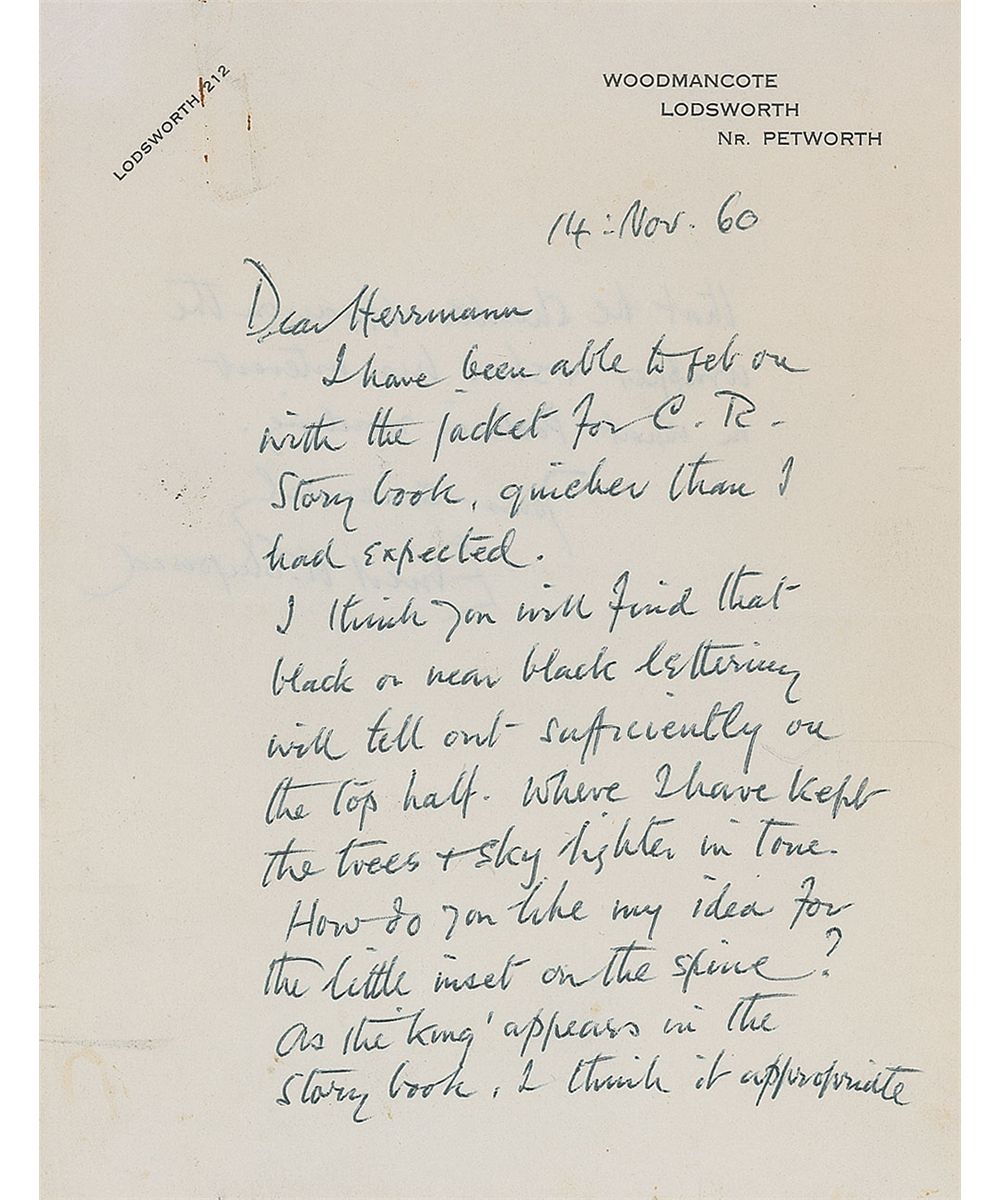 English artist and book illustrator (1879–1976) known especially for his human-like animals in illustrations for Winnie-the-Pooh by A. A. Milne. Rare ALS, one page both sides, 5.25 x 7, Woodmancote letterhead, November 14, 1960, to German book publisher Frank Hermann. In full: “I have been able to get on the jacket for C. R. Story book quicker than I had expected. I think you will find that black or near black lettering will tell out sufficiently on the top half where I have kept the trees & sky lighter in tone. How do you like my idea for the little inset on the spine? As the King appears in the story book, I think it appropriate that he should appear on the wrapper & show his interest in what Pooh is reading.” In fine condition, with some scattered creases and a rusty paperclip mark to top edge. Any autograph material from Shepard is quite uncommon, even more so discussing Pooh and the rest of Milne’s characters.