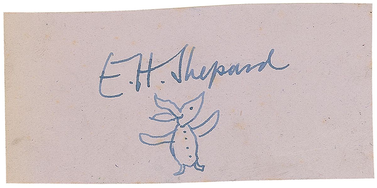 Original and quite rare vintage signed ink sketch of Piglet on a light purple 3 x 1.5 clipped slip, signed above the image, “E. H. Shepard.” Slip is affixed to a slightly larger trimmed album page, with a collector’s notation along the top reading, “Artist in Punch.” In fine condition. Shepard began contributing to Punch during World War I and was on the permanent staff from 1921–1953. It was while at the magazine that he was first introduced to A. A. Milne. Shepard sketches of any Pooh characters are quite rare and supremely desirable.