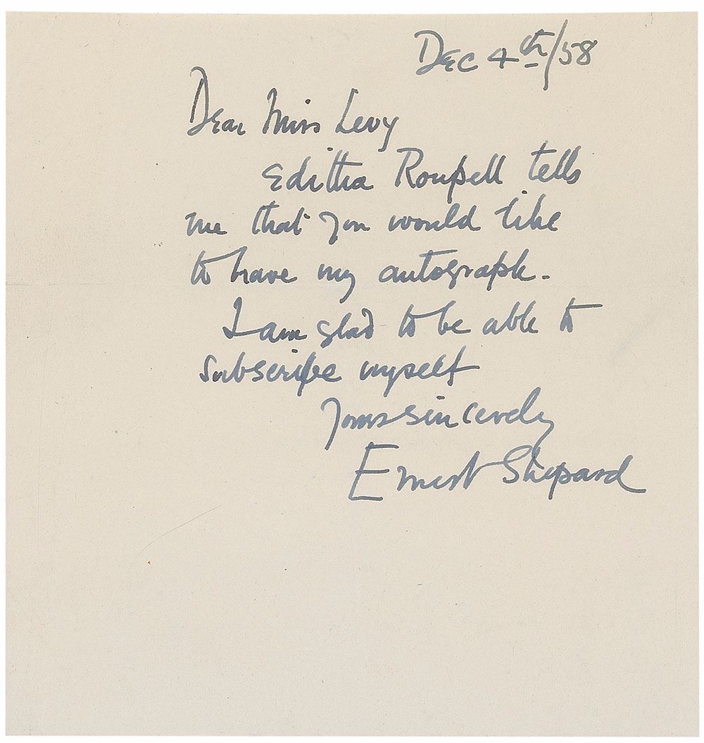 English artist and book illustrator (1879–1976) known especially for his human-like animals in illustrations for Winnie-the-Pooh by A. A. Milne. ALS, one page, 5.25 x 5.5, December 4, 1958. Letter to a young woman. In full: “Edittia Roupell tells me that you would like to have my autograph. I am glad to be able to subscribe myself.” In fine condition.