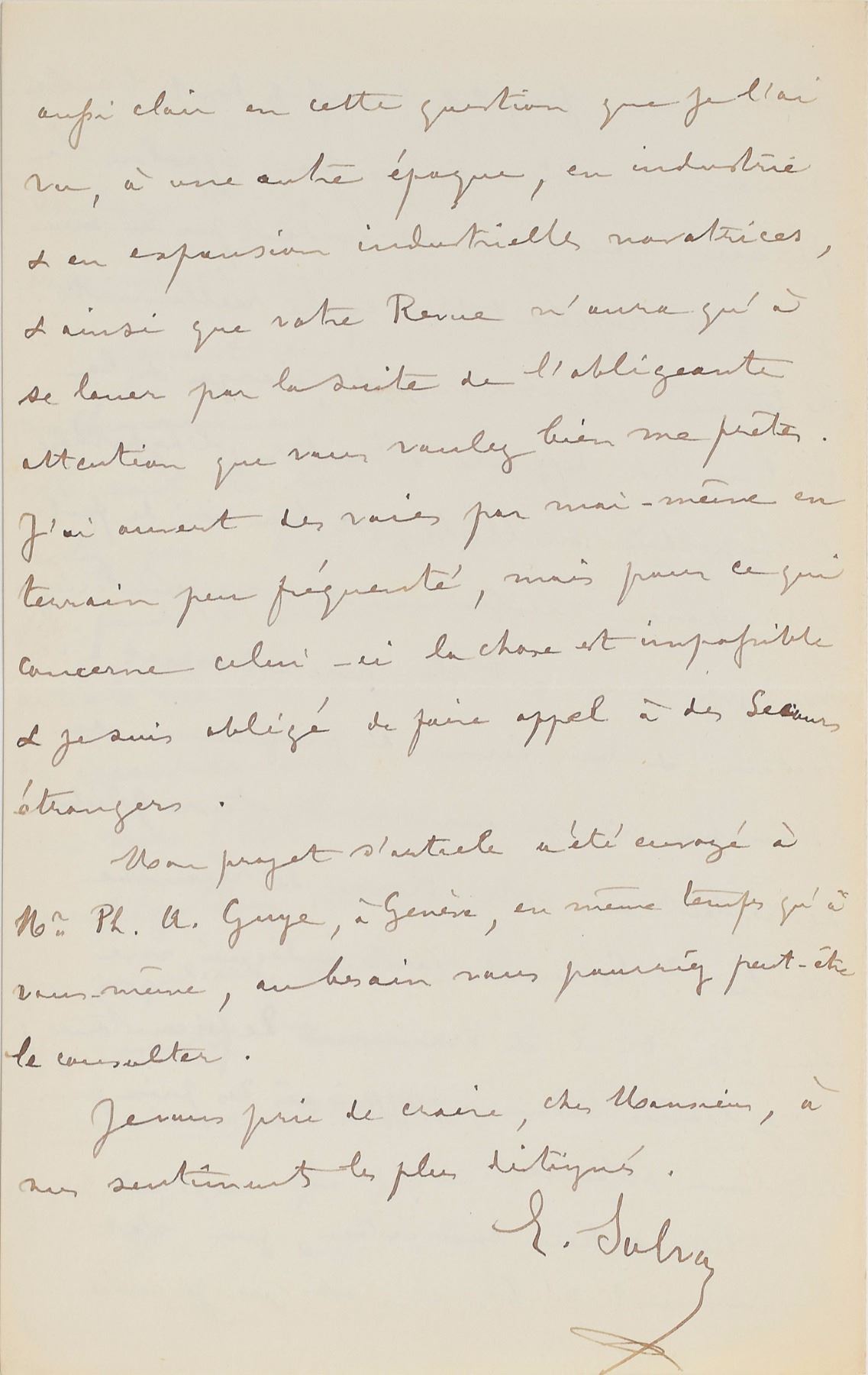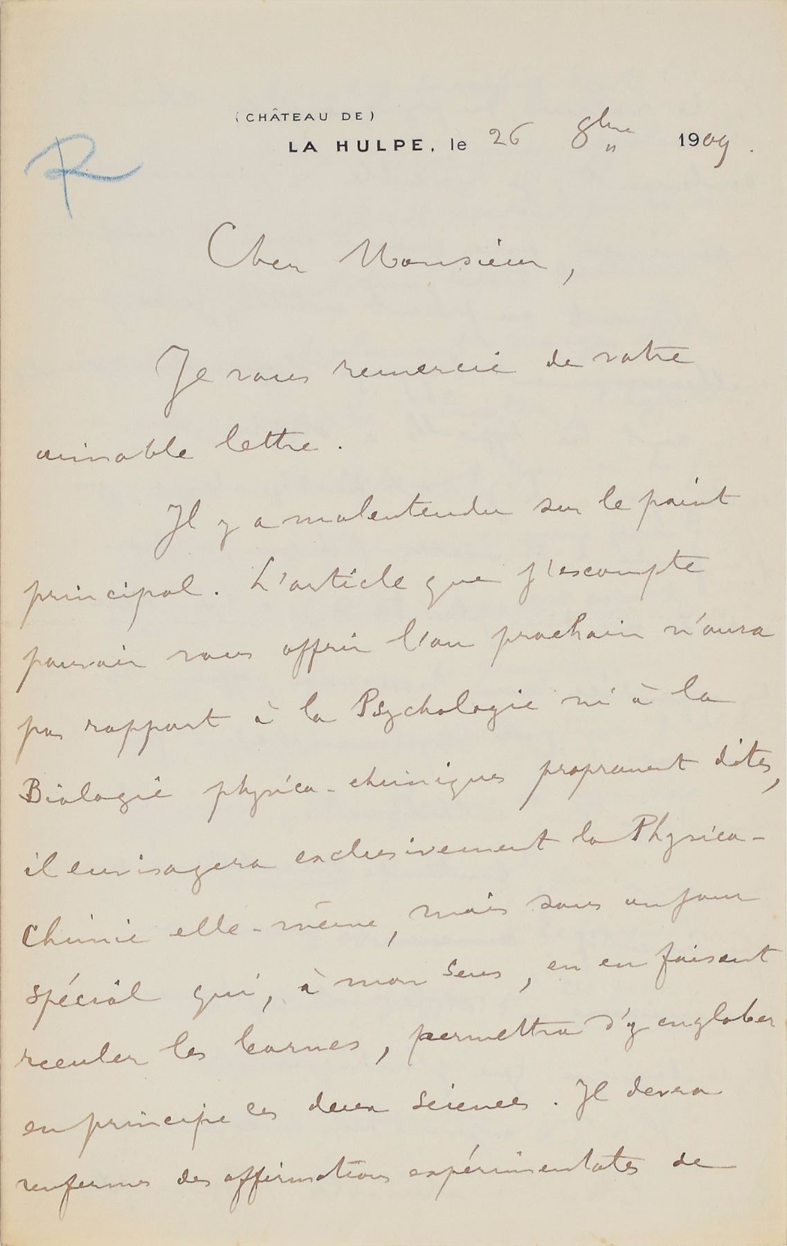 Belgian chemist, industrialist, and philanthropist (1838–1922) who created the famous 'Solvay conferences' where Einstein, Curie, Bohr, Heisenberg, Born, Pauli, Broglie and other physics luminaries would meet and exchange discoveries. Important ALS in French, signed “E. Solvay,” four pages on two adjoining sheets, 4.75 x 7.5, Chateau de La Hulpe letterhead, October 26, 1909. Letter to the director of a scientific review, in part (translated): "I thank you for your kind letter. I think there is a misunderstanding on the main point. The article that I expect to be able to offer you next year has no relation to psychology or biology or the physical chemical biology as we know them. It will regard exclusively physical chemistry itself but under a special light which I am convinced will fill lacunae and will allow us to merge in principle these two sciences. The article should contain experimental statements of high value both in physics and in chemistry and I work to prepare the experiences with great hope of success.