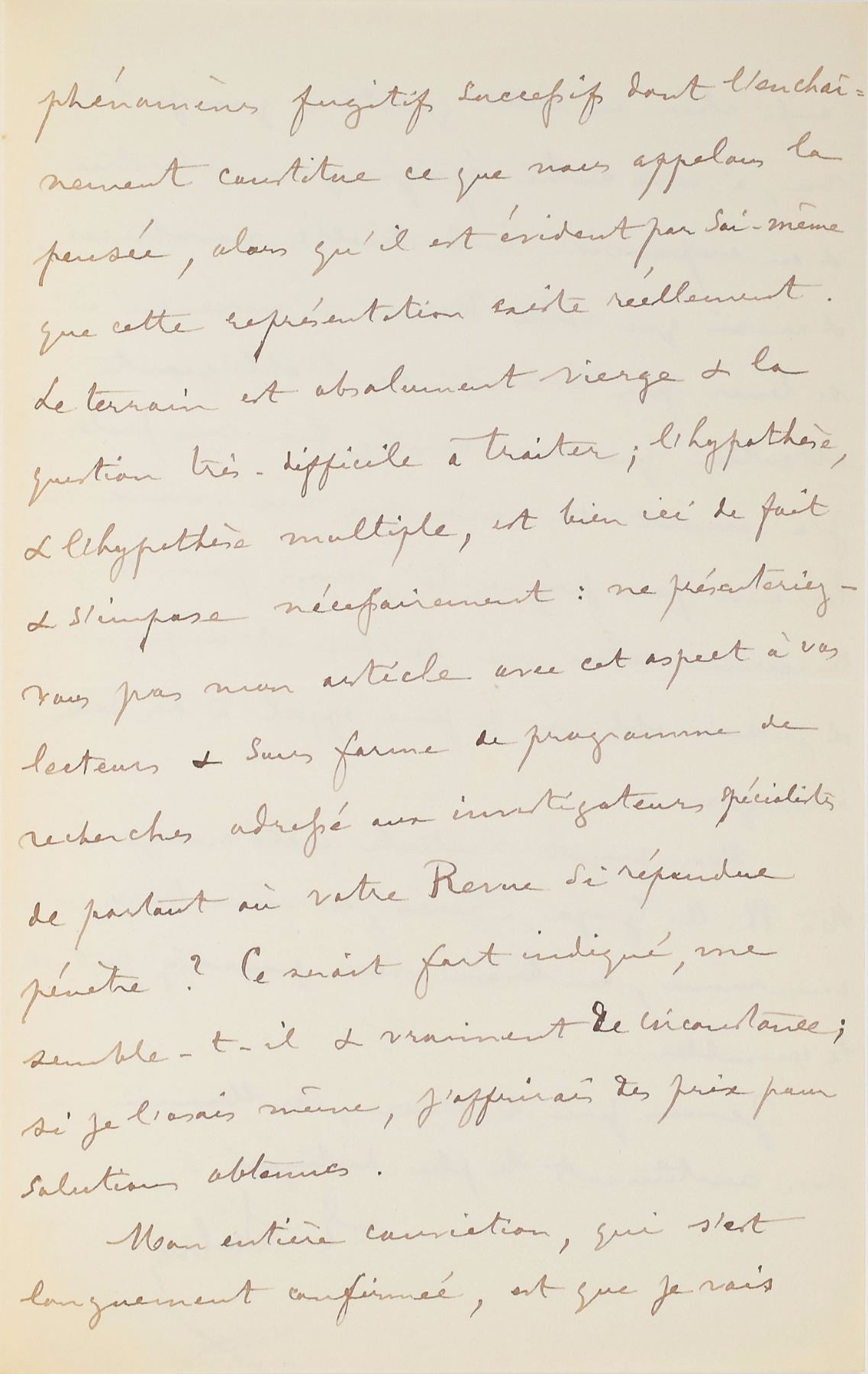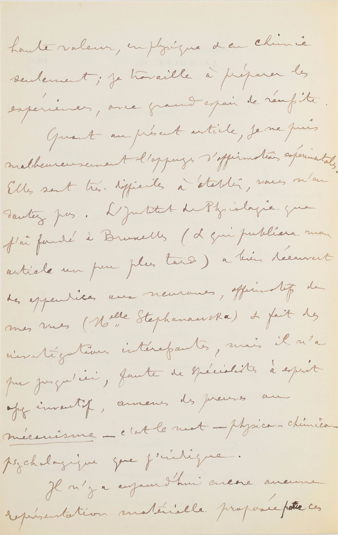 Regarding the present article, I cannot unfortunately prove it with experimental affirmations. They will be very difficult to establish as you can well understand. The institute of physiology that I founded in Brussels (and will publish an article a little later) has indeed discovered the appendages to the neurons that confirm my views (Miss Stephanowska) and have done interesting research but it has not, up to now, due to the lack of specialists with inventive spirits, they have not found the proofs to the mechanism. And that is the word physical, chemical, and psychological that I indicate. There is today still no material representation proposed for the fugitive and successive phenomena which sequence constitutes what we call thought.