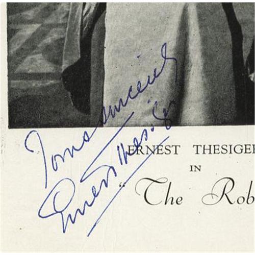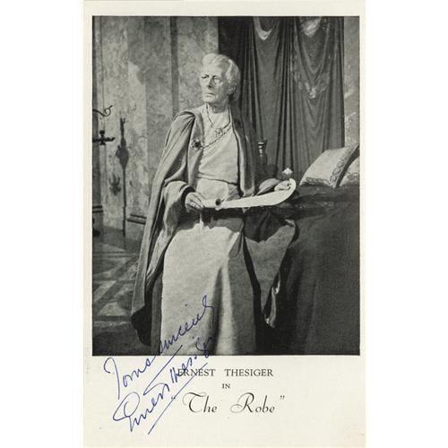 <B>Ernest Thesiger Signed Picture from The Robe.</B></I> "To a new world of Gods and Monsters!" toasts Ernest Thesiger as Dr. Pretorius, the mad and mincing wizard of James Whale's <I>Bride of Frankenstein.</B></I> Golden Age Horror fans revere the skeletal, witch-nosed Thesiger (1879-1961) for this charmingly devilish performance, as well as his marvelously macabre Horace Femm in Whale's <I>The Old Dark House.</B></I> Actually, Thesiger's most lavish Hollywood film was <I>The Robe,</B></I> in which he played Emperor Tiberius, and this 3.5" x 5.5" postcard features a fine black-and-white study of Thesiger in that memorable role. The actor has signed "Yours sincerely Ernest Thesiger" in blue ink. The post card is unusual, apparently issued as publicity for this 1953 20th Century-Fox epic, the first film in Cinemascope - the card reads "Ernest Thesiger in <I>The Robe</B></I>" below his picture. The verso has minor residue from having been preserved in an album, but picture and signature are totally clean; overall Very Fine + condition. Thesiger's autograph is scarce in any form - this is a very desirable one, as well as being a souvenir from an historic Hollywood spectacular. <I>Accompanied by LOA from PSA/DNA.</B></I><BR><BR><b>Shipping:</b> Flat Material, Small (<a target="_blank" href="http://www.heritageauctions.com/common/shipping.php">view shipping information</a>)